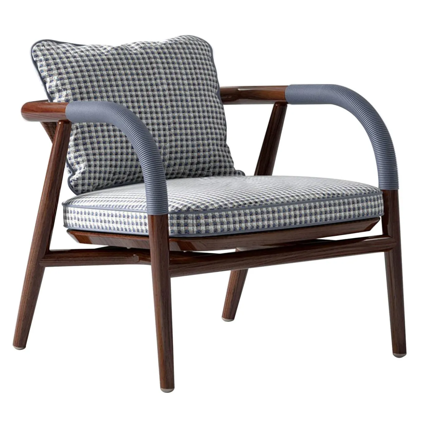 Armchair with all-in fabric. Piping in leather. Structure in high glossy Sapeli Mahogany. Metal details in brushed steel.