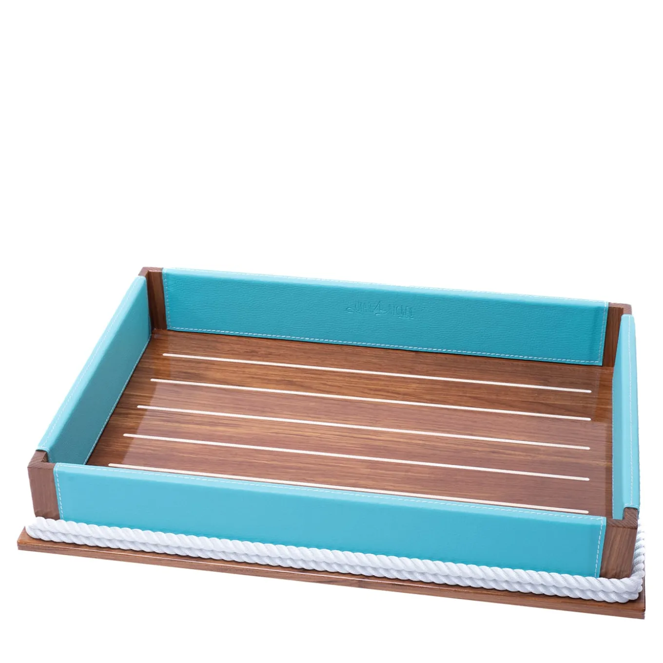 Enriched with straight lines reminiscent of boats’ decks, this sturdy wooden tray makes for the perfect solution for serving an aperitif or tea to be enjoyed while breathing in some sea breeze. White ropes of nautical inspiration embrace its silhouette, detailing that adds to light-blue faux leather accents covering the sides for eased grip and a fresh chromatic statement.