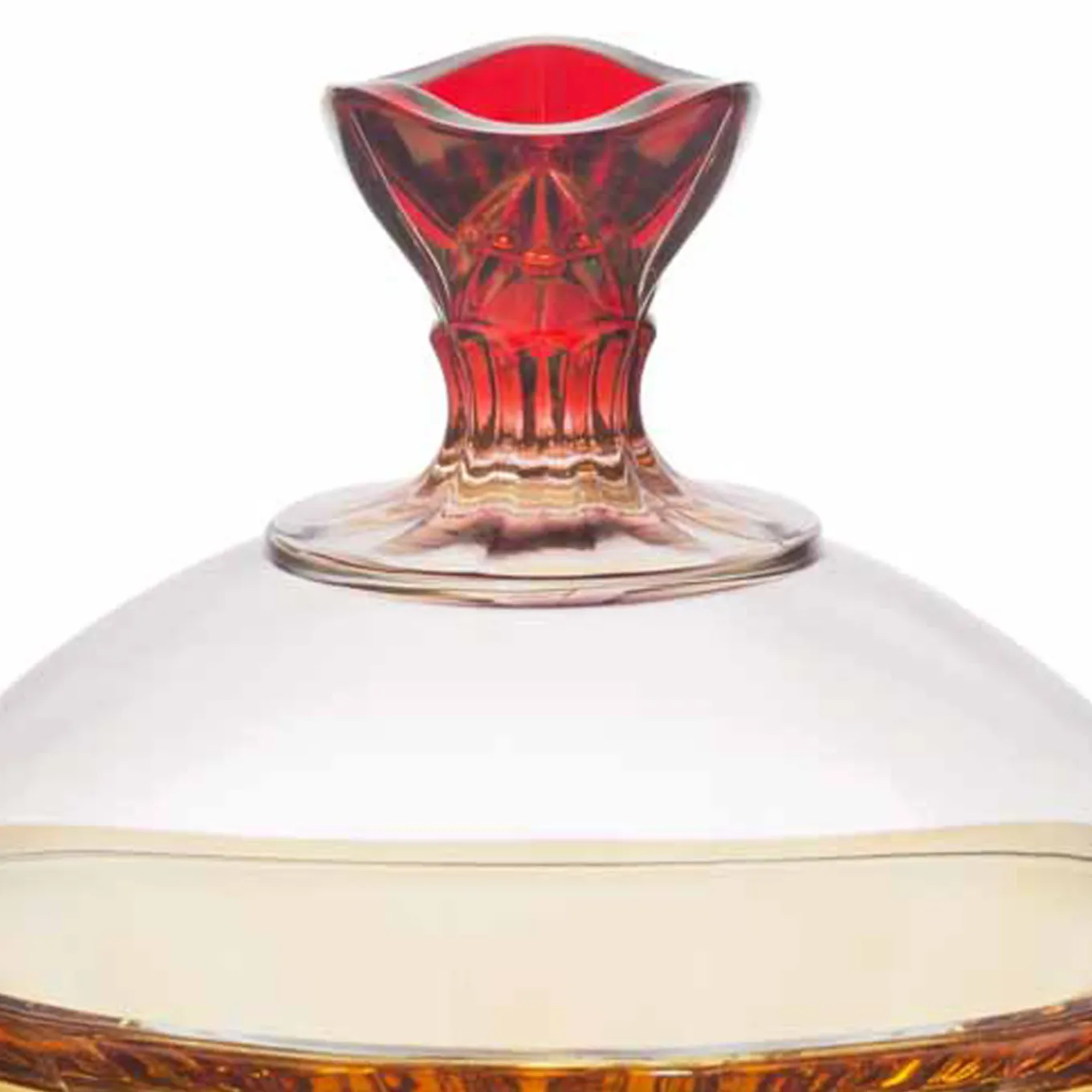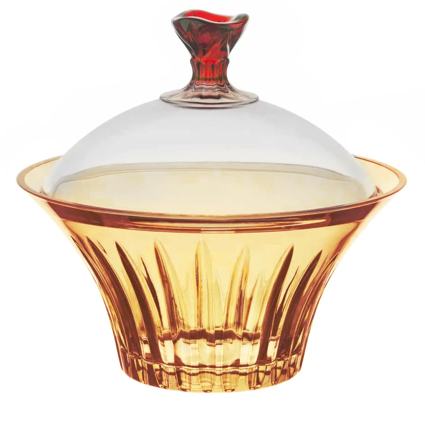 This unique decorative box comes complete with a lid and a container crafted entirely in crystal. The yellow color of the crystal box is complemented by its clear lid, which is accented by a rich red knob for easy opening.