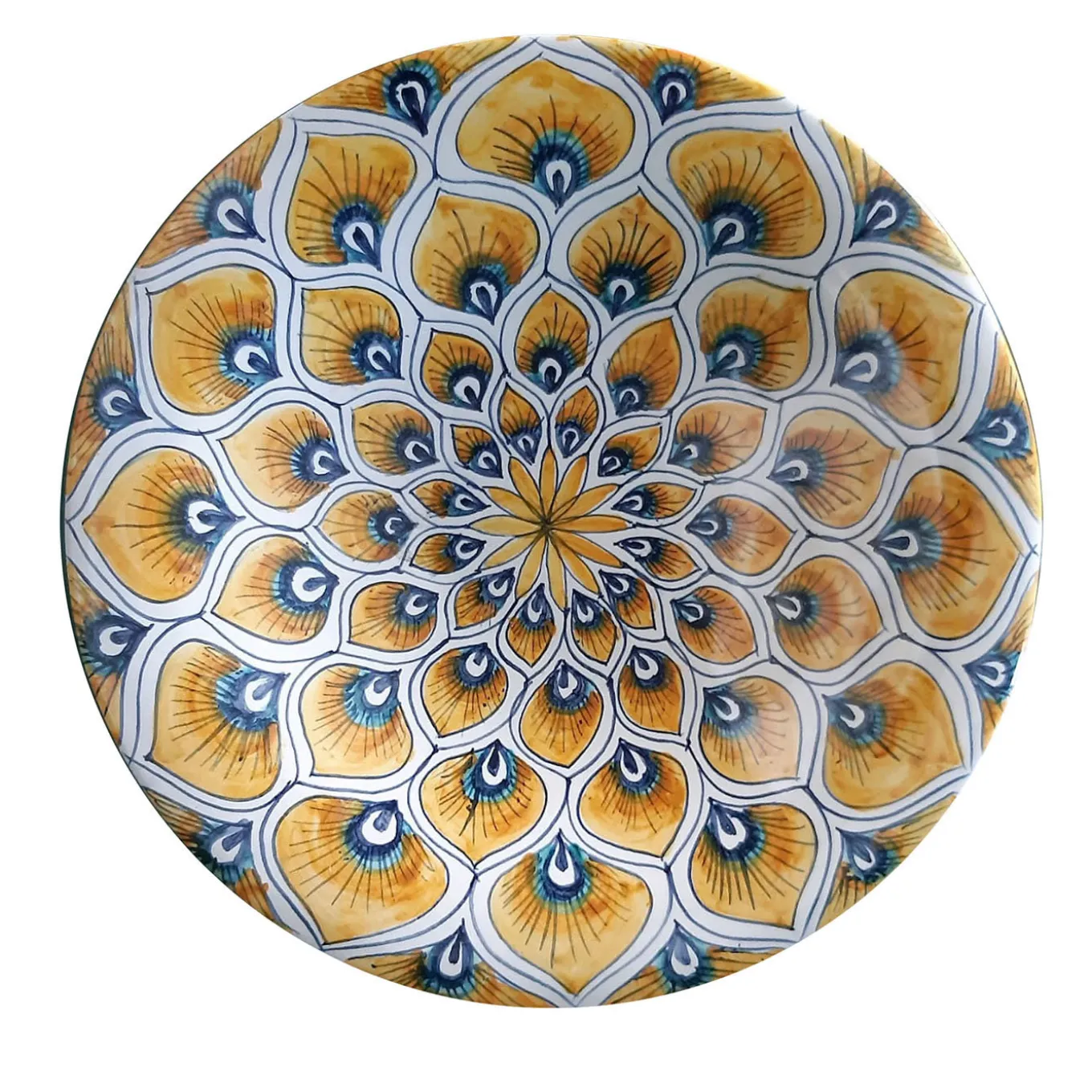 This flattering decorative plate (⌀ 25cm) fashioned of first-rate ceramic exemplifies the artistry of master ceramist Maria Rita Nicolini, who designs and painstakingly handcrafts every piece. Adorned with a radial motif of peacock feathers rendered in yellow, blue, and black enamels, its striking decorative impact lends it with the allure of a non-replicable objet d’art. It can also be showcased in pairs in different sizes, please contact the Concierge.