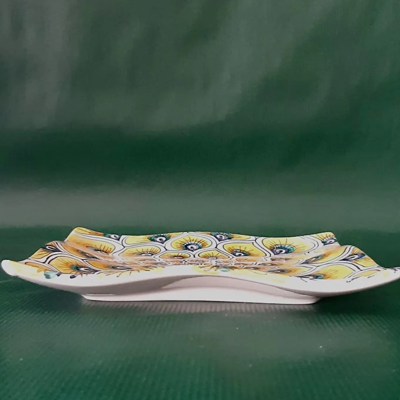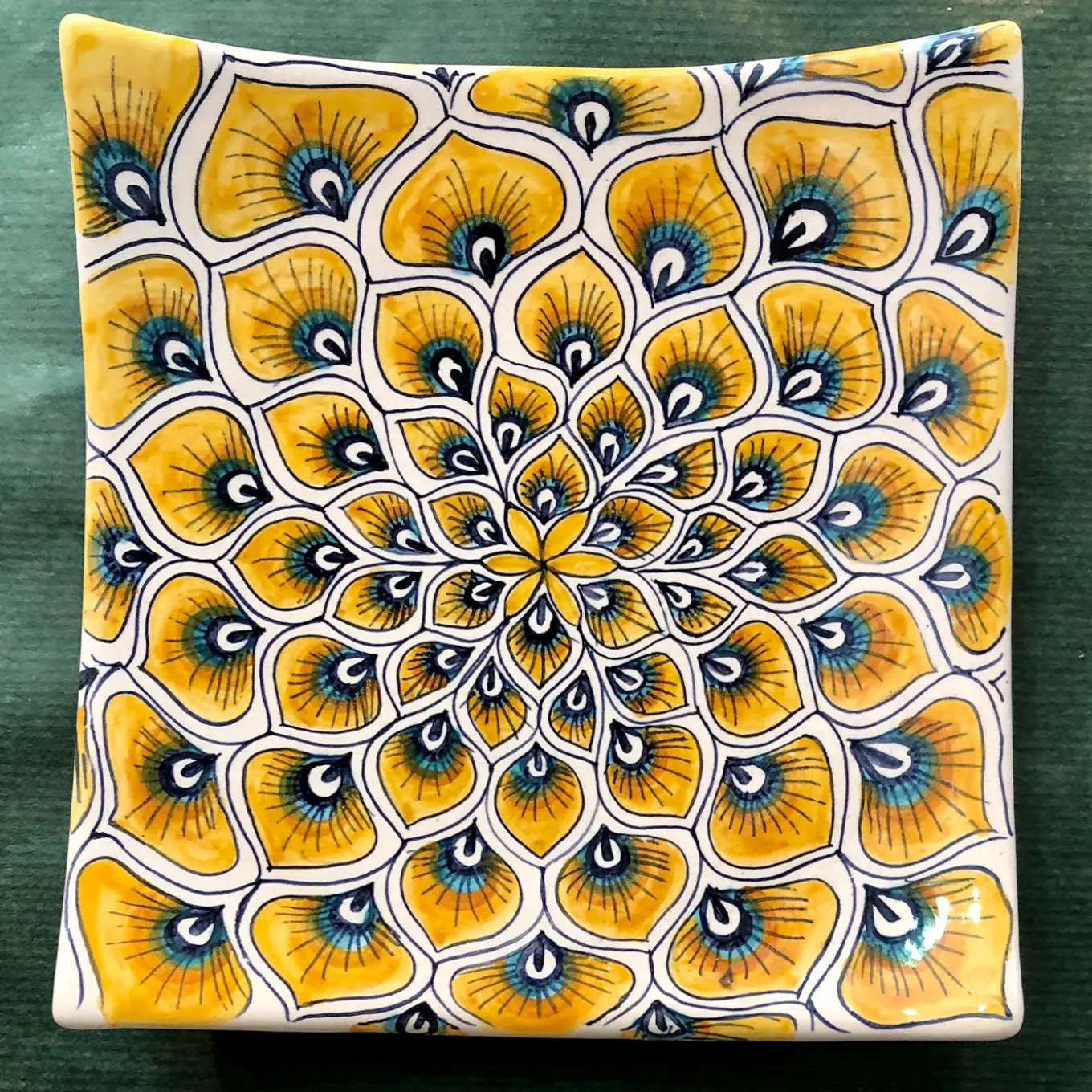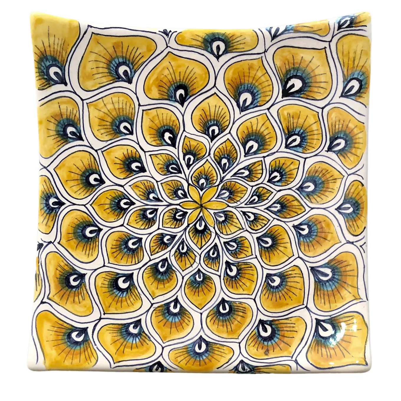 A striking piece sure to make a superb decorative statement on any table setting, this square serving plate in majolica is richly adorned with a lively motif of peacock feathers in yellow and blue tones minutely hand-painted by master ceramist Maria Rita Nicolini. This one-of-a-kind piece from the Yellow Peacock Feather Collection can be displayed alongside pieces from the same series for a cohesive and impactful look.