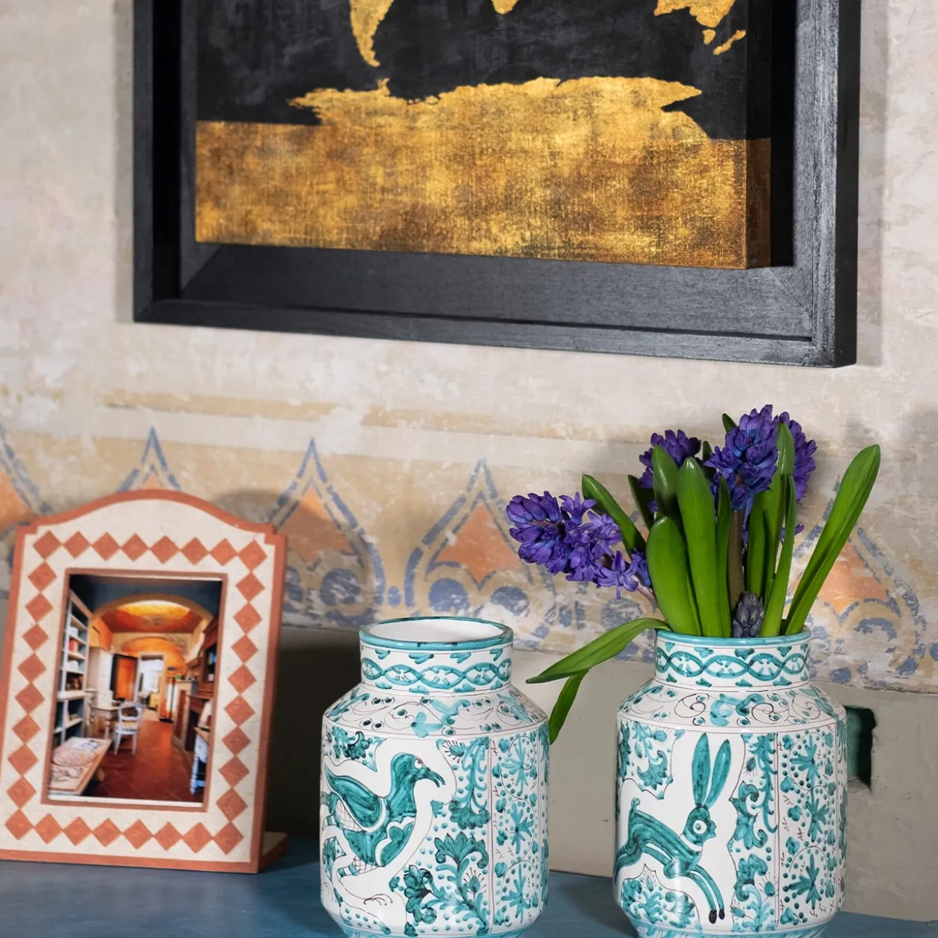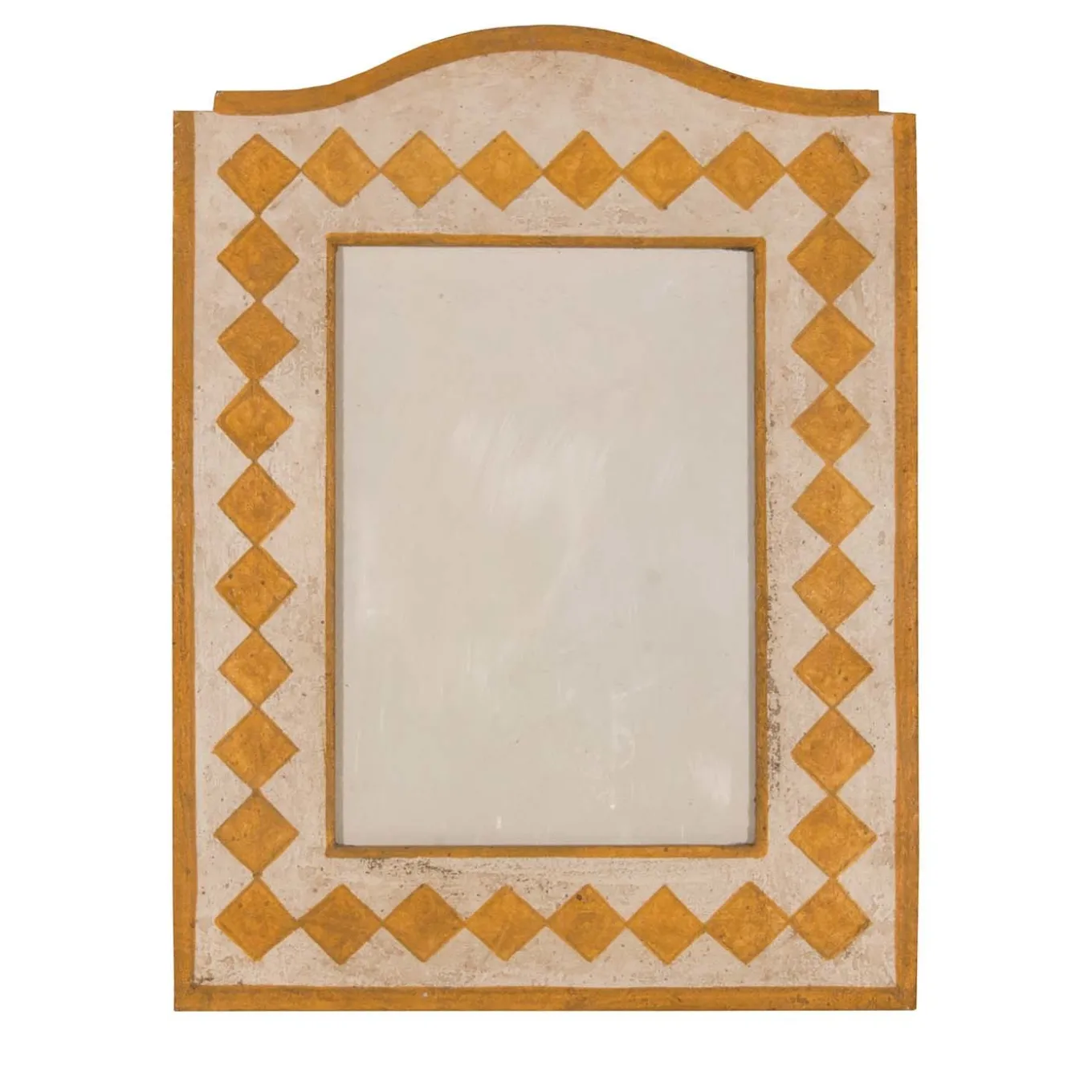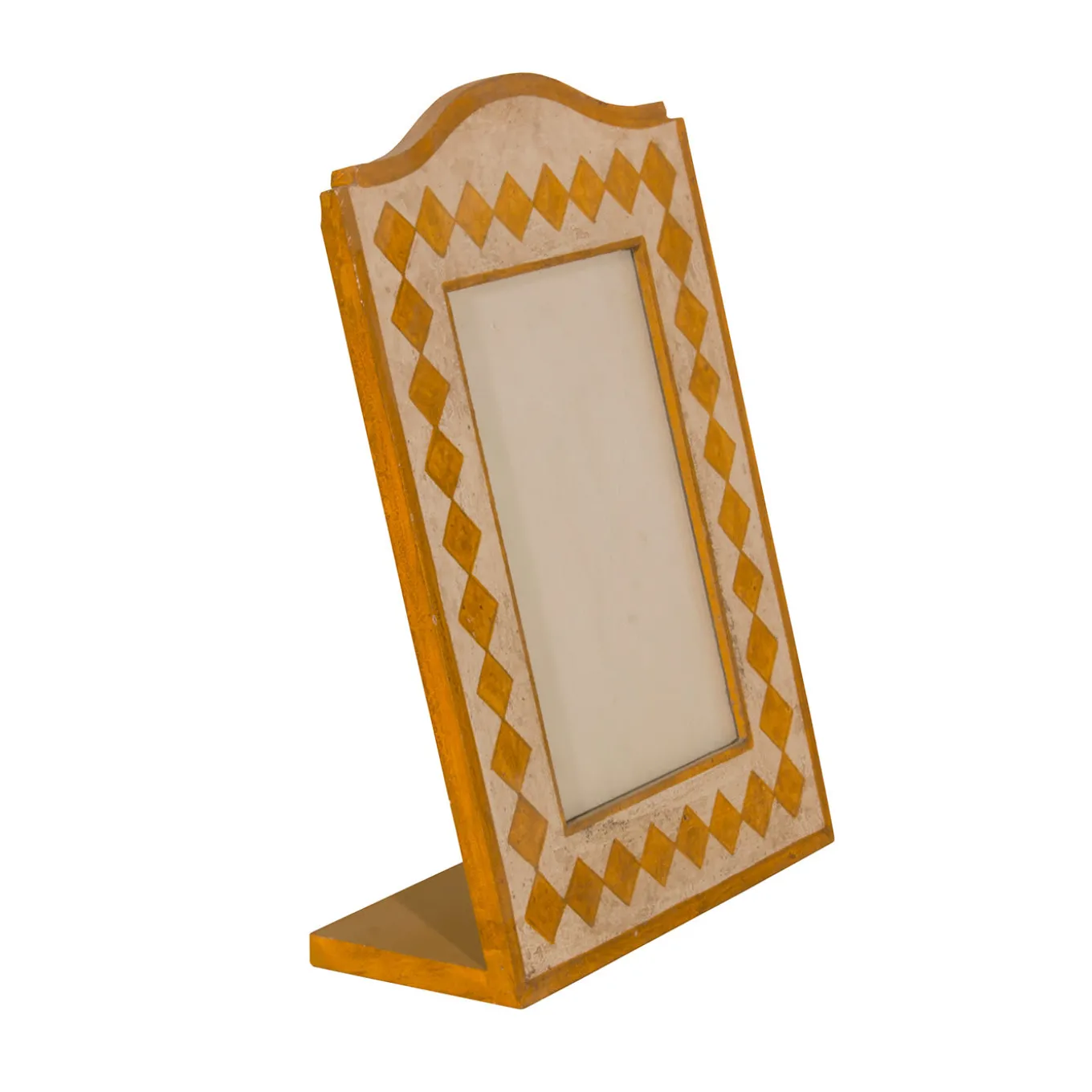 This rectangular picture frame will lend sophistication to a rustic interior decor while displaying cherished memories. Fashioned using ancient Florentine crafting methods, this wooden frame is hand-painted in white acrylic tempera with elegant diamond accents and borders in vibrant yellow. The frame’s marbled texture is obtained using a sponge, evoking the “encausto veneziano” finish found on church and palace fa√ßades. This frame provides an elegant way to curate an inviting entryway or bring a personal touch to a room. Protective beeswax coating creates a glossy and timeless finish.