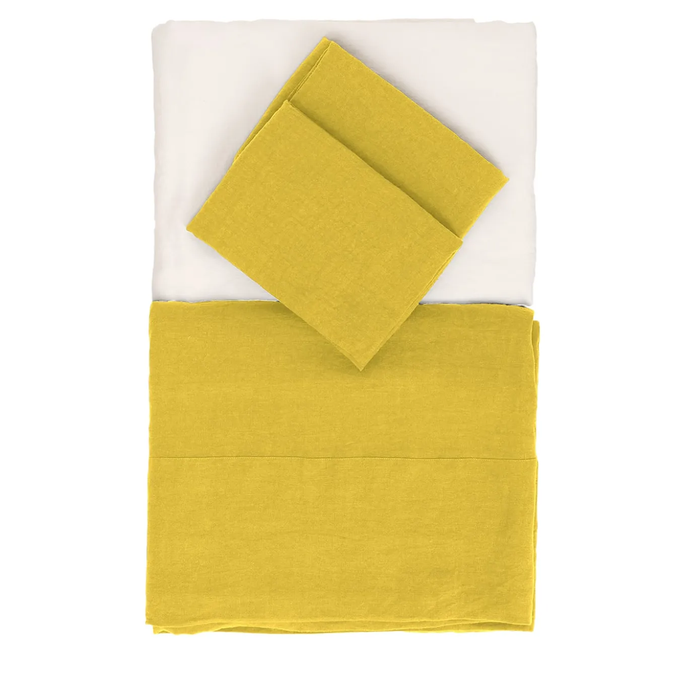 An elegant and colourful set entirely handmade of the finest linen, this set comprises a top sheet with matching pillowcases dyed in a sophisticated sunny yellow, and a white fitted sheet that will fit a 30 cm-deep mattress. The delicate hue of the yellow is relaxing and ideal to pair with a room painted and furnished in neutral colours. Available in different sizes – please ask the concierge for pricing and details.