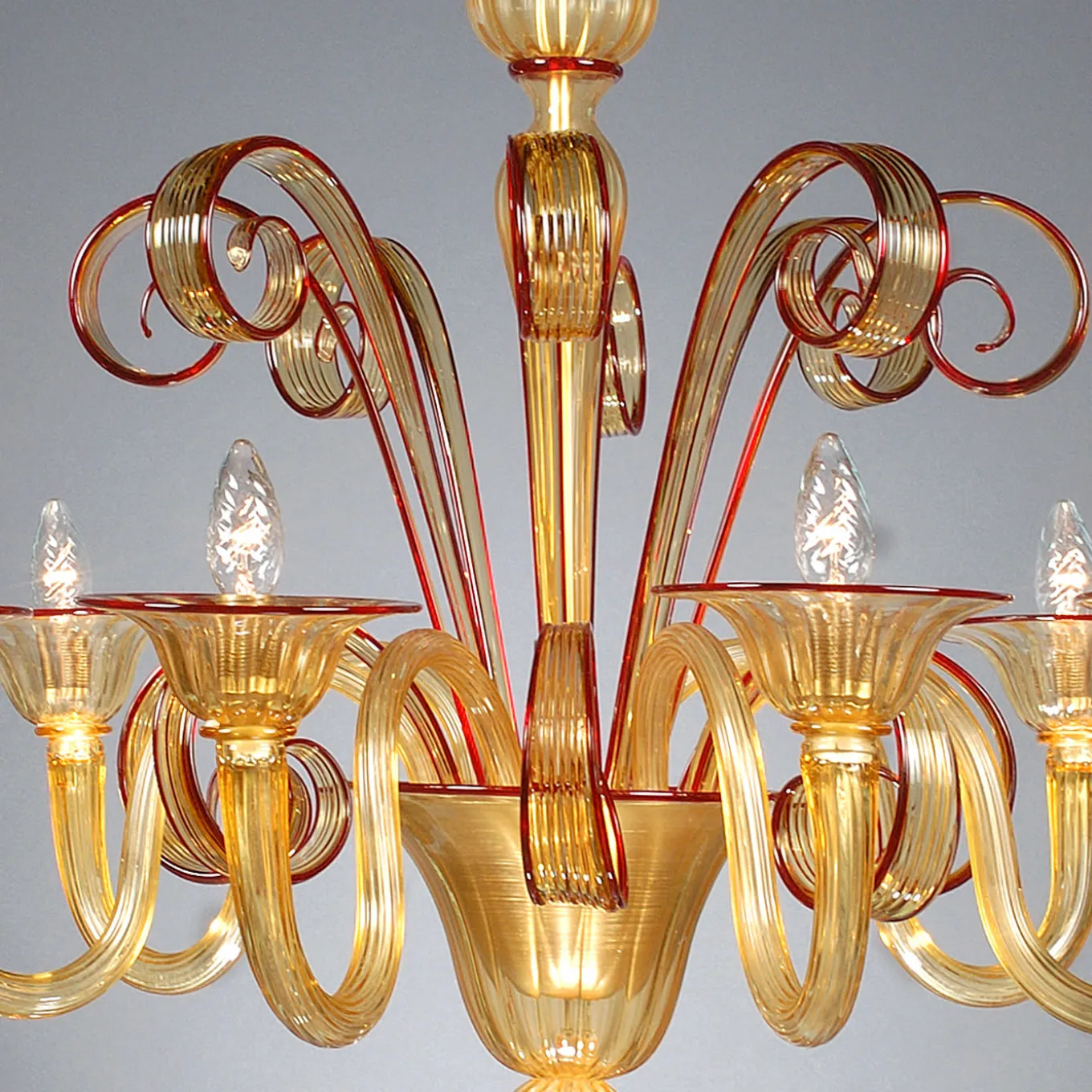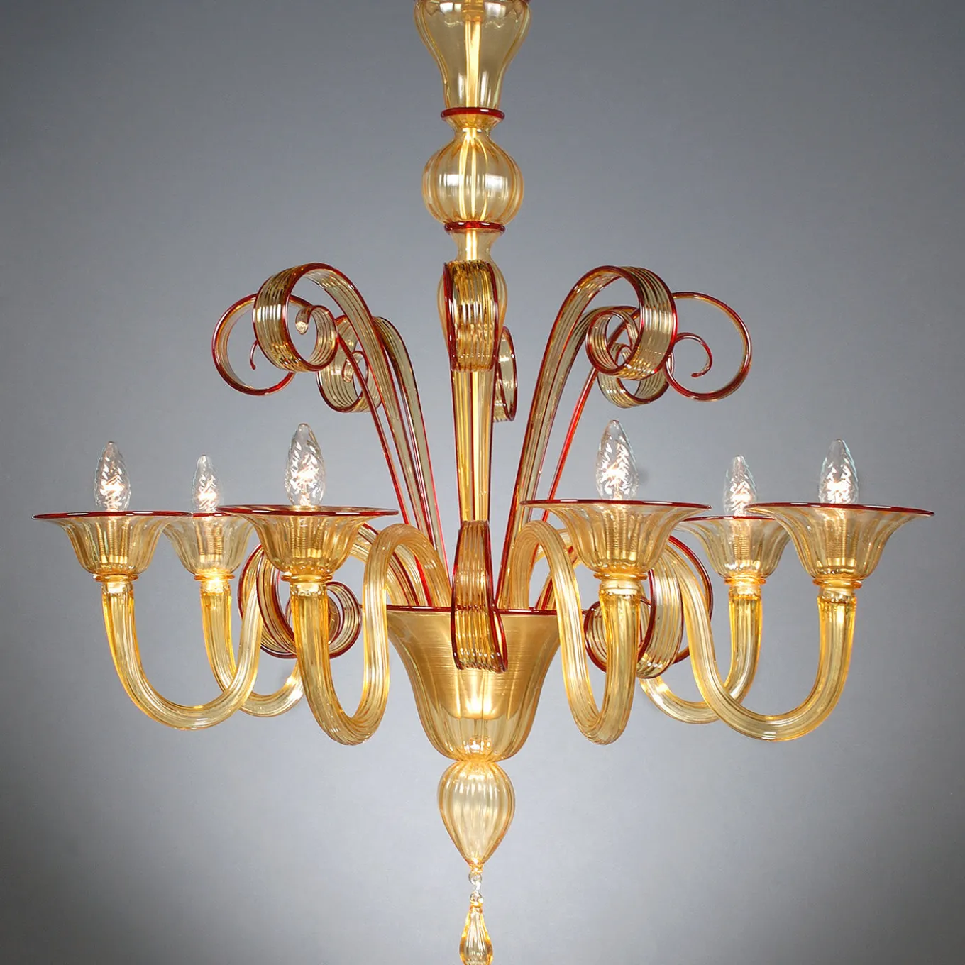 This striking chandelier features six lights supported by curved arms in a striking yellow color. The curls that decorate the top and central part of this piece are accented with red edges, giving a striking final effect.