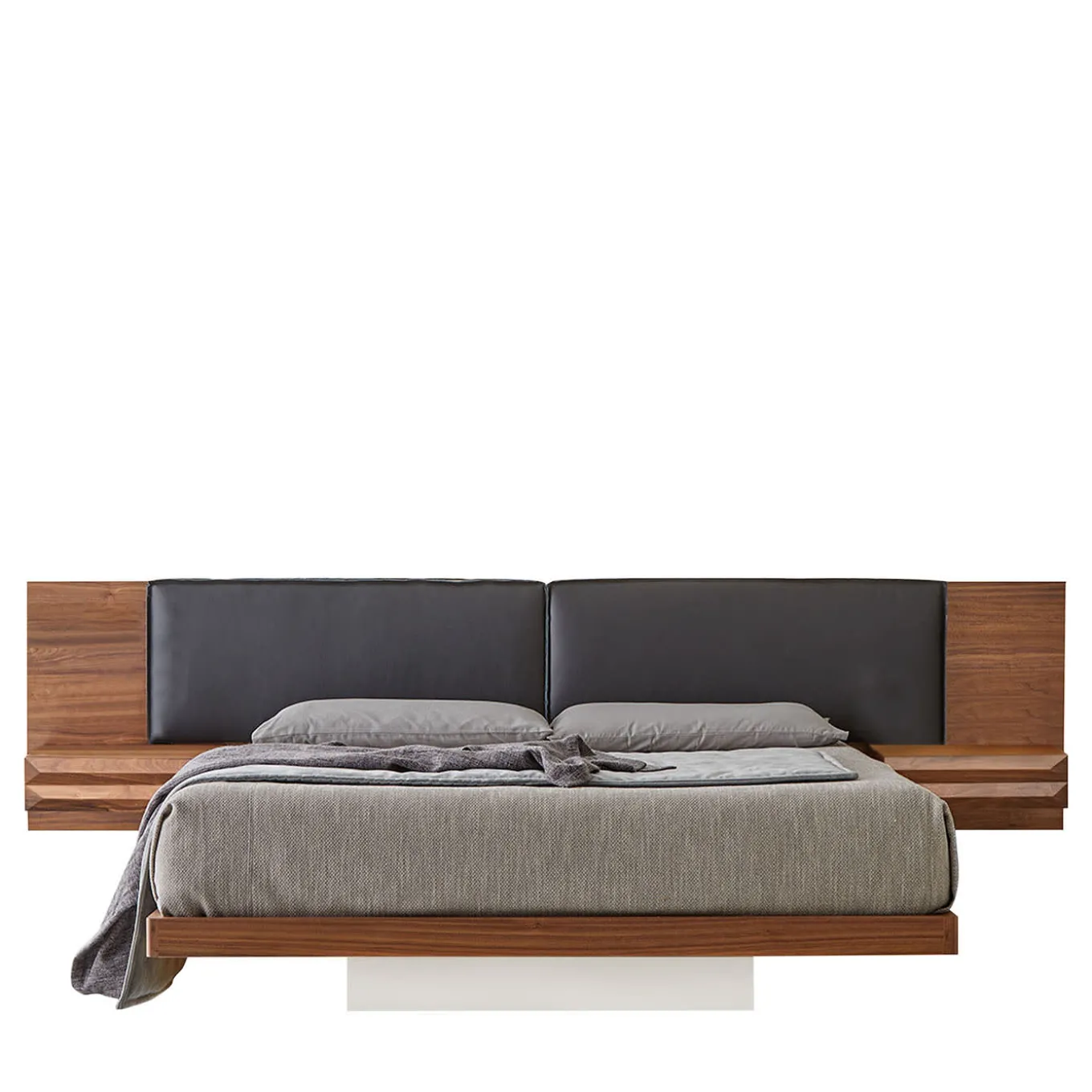 York Soft bed features a headboard made entirely of Canaletto walnut wood with cushions upholstered in Black leather. It is sustained by a tempered glass foot and equipped with a couple of wooden nightstands comprising soft-close drawers with recessed handles. Included in the price are LED lighting for headboard and glass foot with the possibility of switching on with app or remote control. The headboard is to be fixed to the wall with a special fixing system provided by the company. Bedframe, mattress and pillows are not included. Please ask the Concierge for customization options.