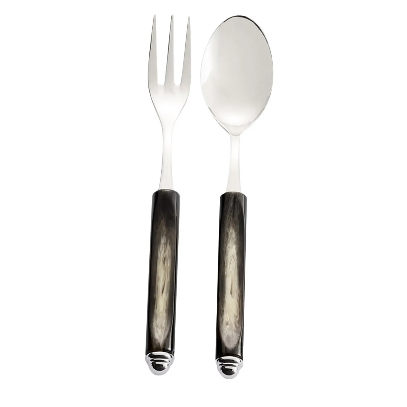 Minimalist profiles ennobled by exceptional materials and designs define the charming personality of this two-piece serving cutlery. Easy to use and portion food with, the pieces are handmade from glistening stainless steel, complemented by fascinating handles in bio-based Meba certified resin reproducing the shades and veins of natural horn. It pairs beautifully with other elements from the Zambia series. Fine velvet case included with purchase.