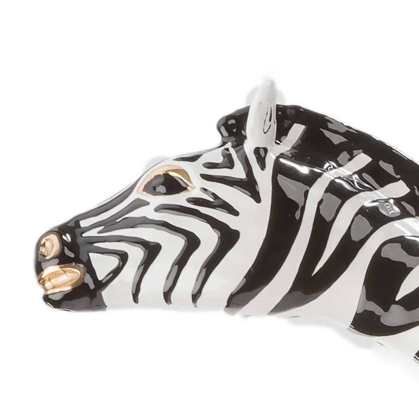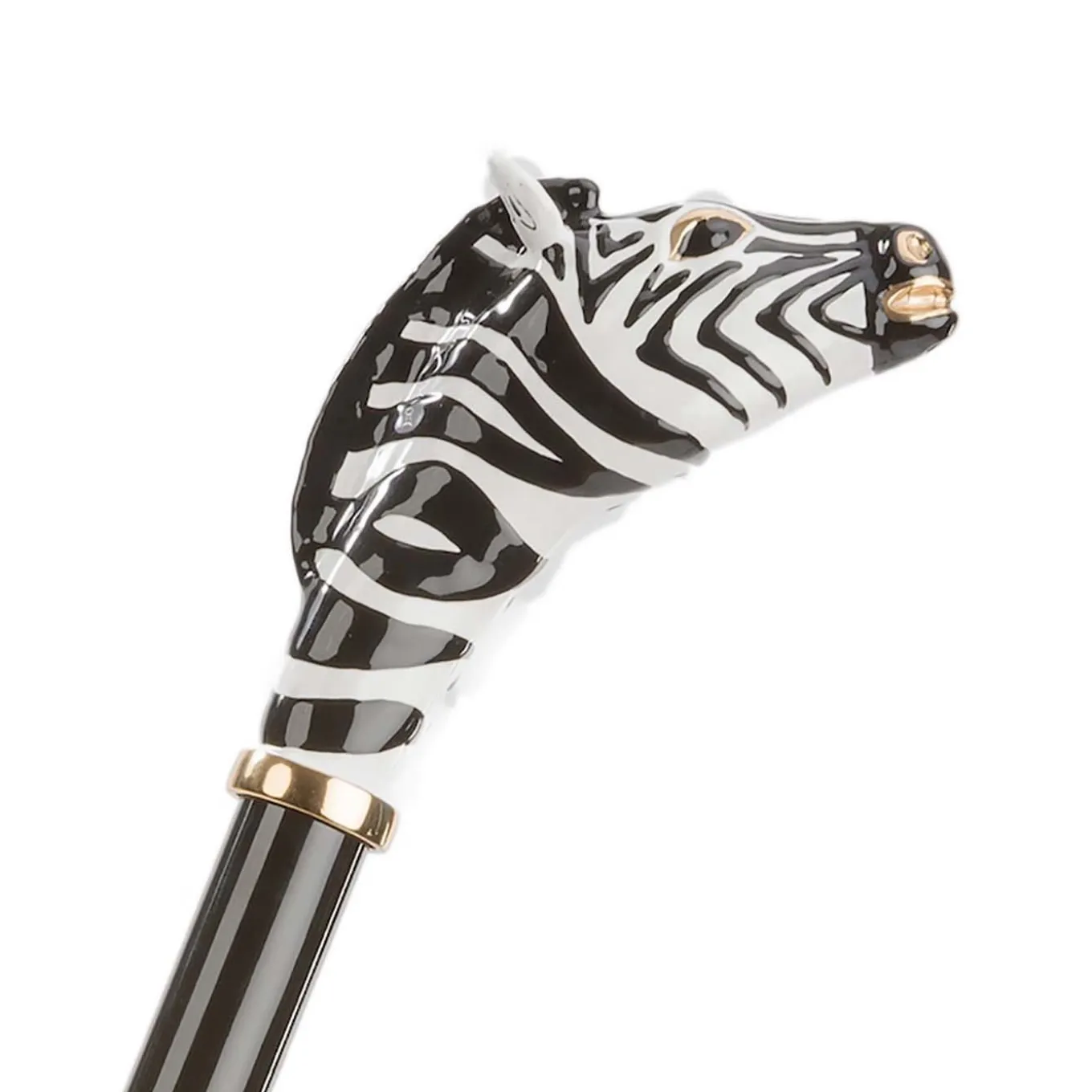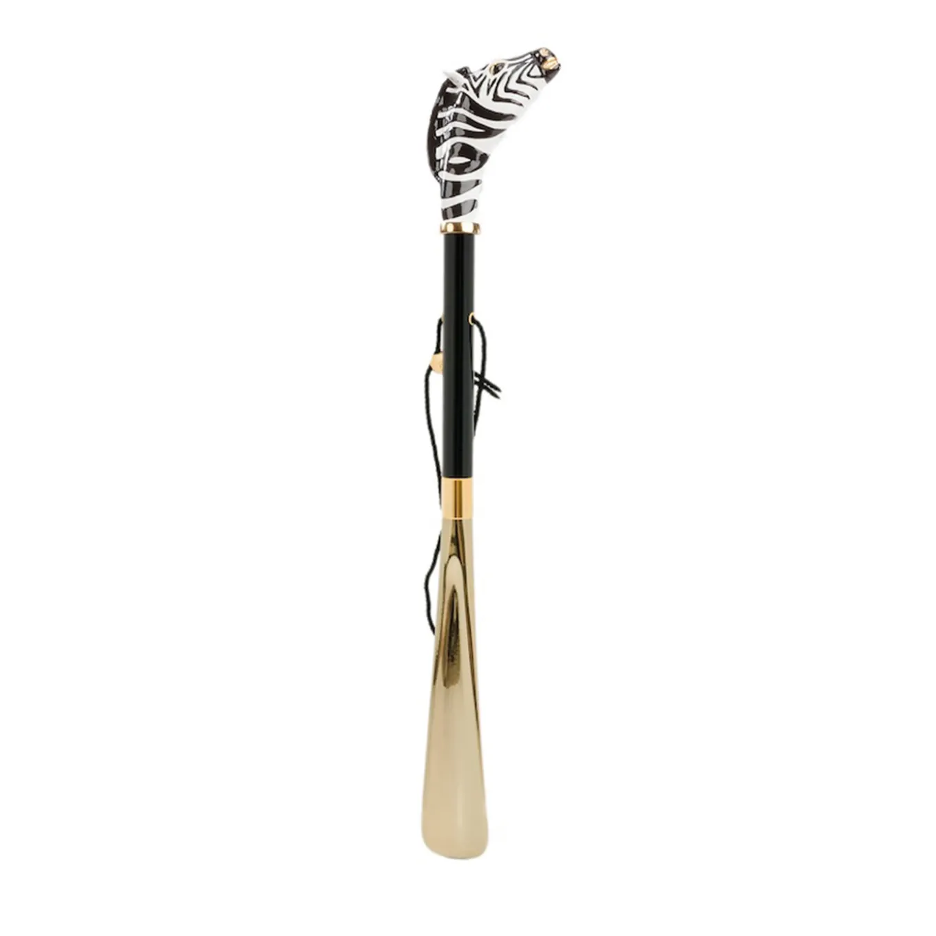 The Zebra Shoehorn is a striking accessory featuring an enameled brass handle in the form of a zebra head, wooden shaft and ABS end. Black and white with brass trim, the shoehorn is 50 cm long and is handmade in Italy.