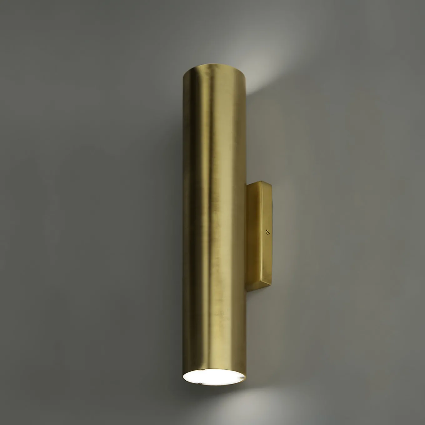 Shown at Milan Design Week 2018, this exquisite sconce was crafted of brass with a brushed finish in the shape of a cylinder attached to the wall with a rectangular base. The top and bottom of the cylinder are covered with polycarbonate disks with an opaline-like finish. The effect is elegant and timeless and will equally embellish a classic bedroom or a contemporary living room. Paired with an identical one to flank a mirror, it can provide a sophisticated touch to an entryway or bathroom.