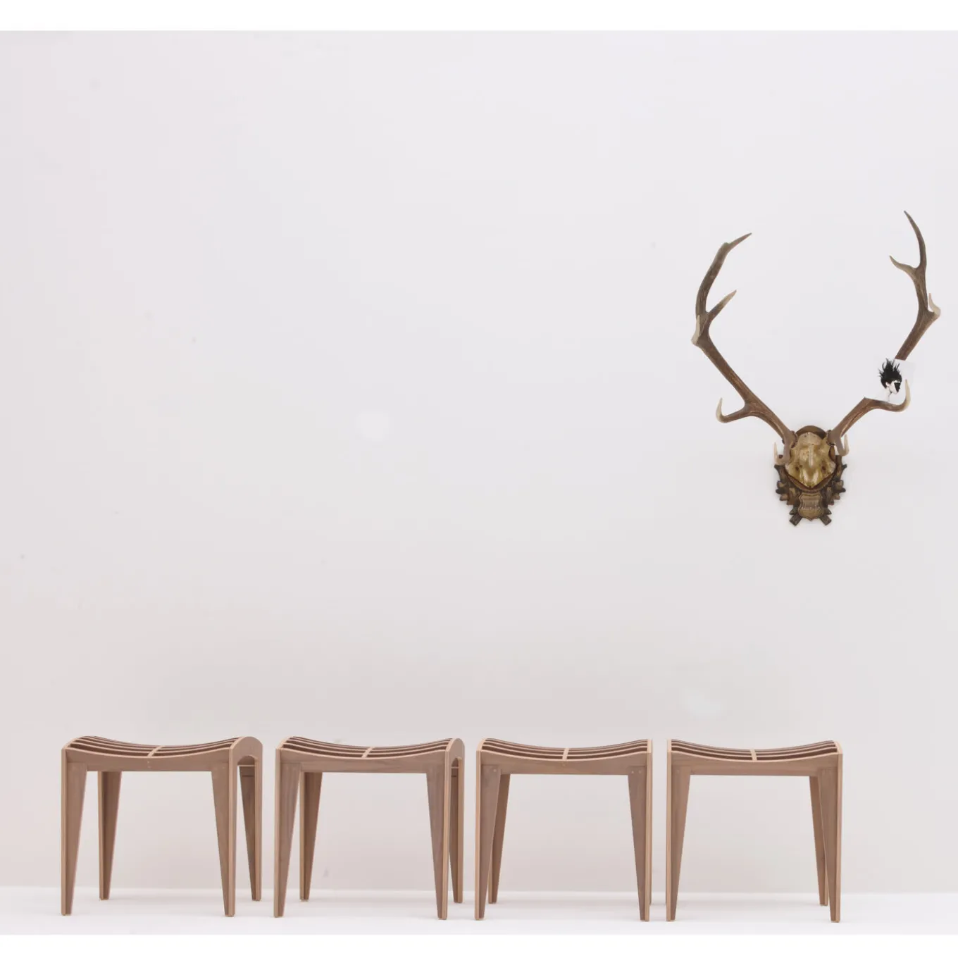 Franco Poli designed this striking piece for Morelato and it is the harmonious result of the mix between design and ideal choice of material. The stool is made of plywood with walnut veneer, assembled with wooden pins only. The seat is made of lists of wood gathered by single joints and pins and features a curved surface that is also light. Ideal for any room, this piece will also be a stylish addition to a workplace and can be used alone or paired with others to create interesting patterns.