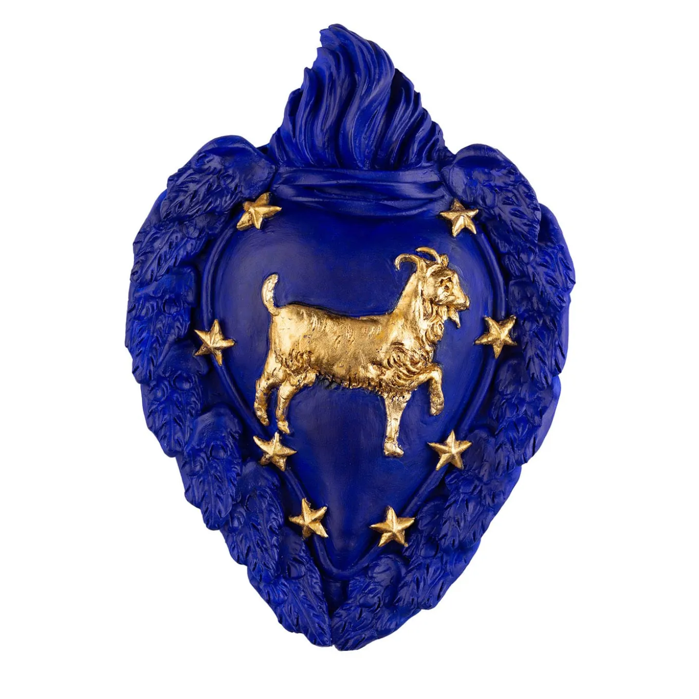 Responsible, stable, and truthful a Capricorn is a trusted friend. Inspired by the zodiac signs featured in the Venetian St. Mark’s clock, this hand-crafted and -decorated ex-voto piece showcases a captivating Majorelle blue palette with a central gold leaf goat motif framed by gold leaf molded stars. Embellished by a graceful frame of feathery angel wings, it makes a superb original gift for a special Capricorn in your life.