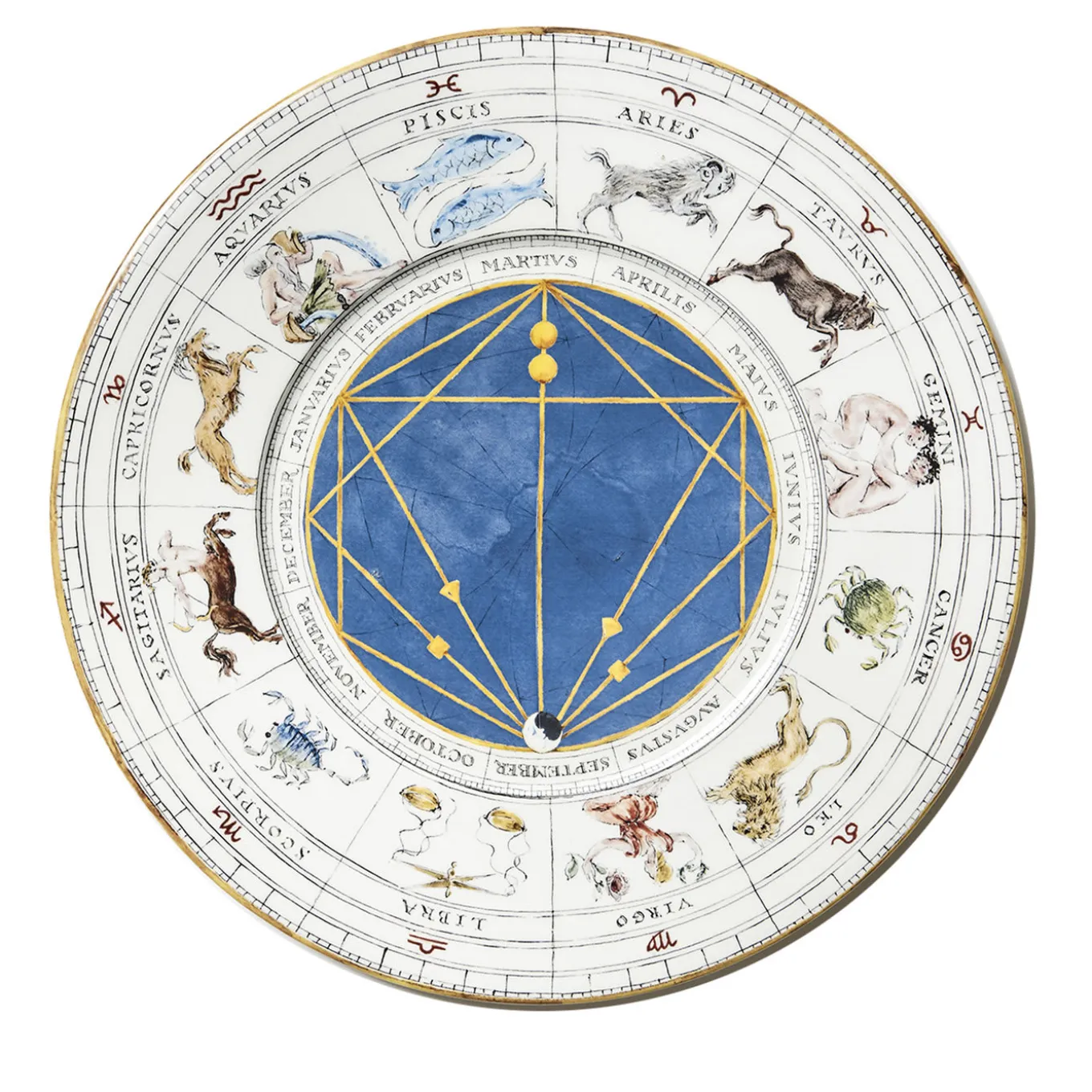 The twelve signs of the Zodiac navigate the astral geography along with their celestial coordinates, and a thirteenth element brings them together in a complete circle on the edge of the plate. Embellished with stellar gold patterns, they are an irresistible attraction for astrology enthusiasts, those who love the stars, and those who do not read horoscopes but are fascinated by the sky and the night.