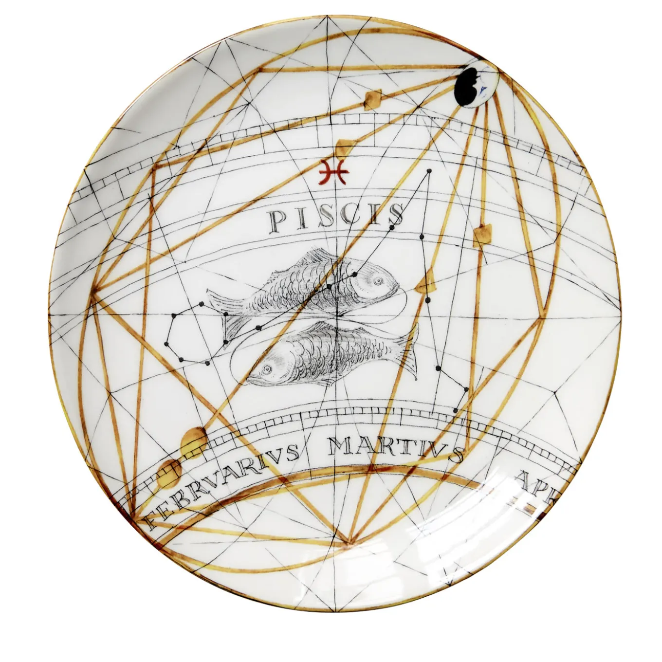 The twelve signs of the Zodiac navigate the astral geography along with their celestial coordinates, and a thirteenth element brings them together in a complete circle on the edge of the plate. Embellished with stellar gold patterns, they are an irresistible attraction for astrology enthusiasts, those who love the stars, and those who do not read horoscopes but are fascinated by the sky and the night.