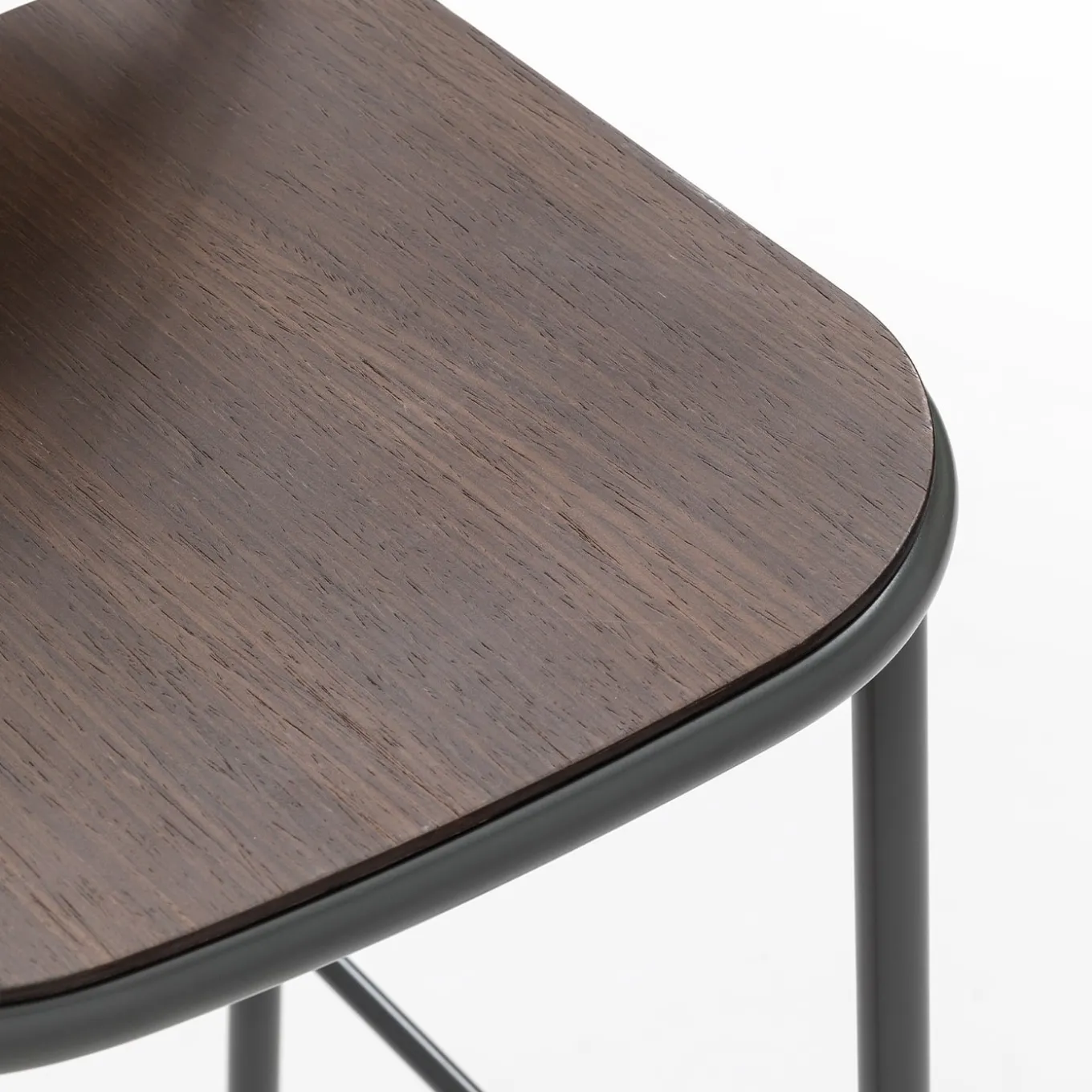 Metal and oak come together to reveal the sleek design of this bar stool by Studio Gabbertas. Also available in a lower version, it features a 75cm-high seat and backrest both in thermo-treated oak, elements adding a dash of organic flair to a cylindrical metal structure (RAL 7043) of minimalist inspiration. Versions in ash, light oak, or black aniline are also available, please inquire with the Concierge.