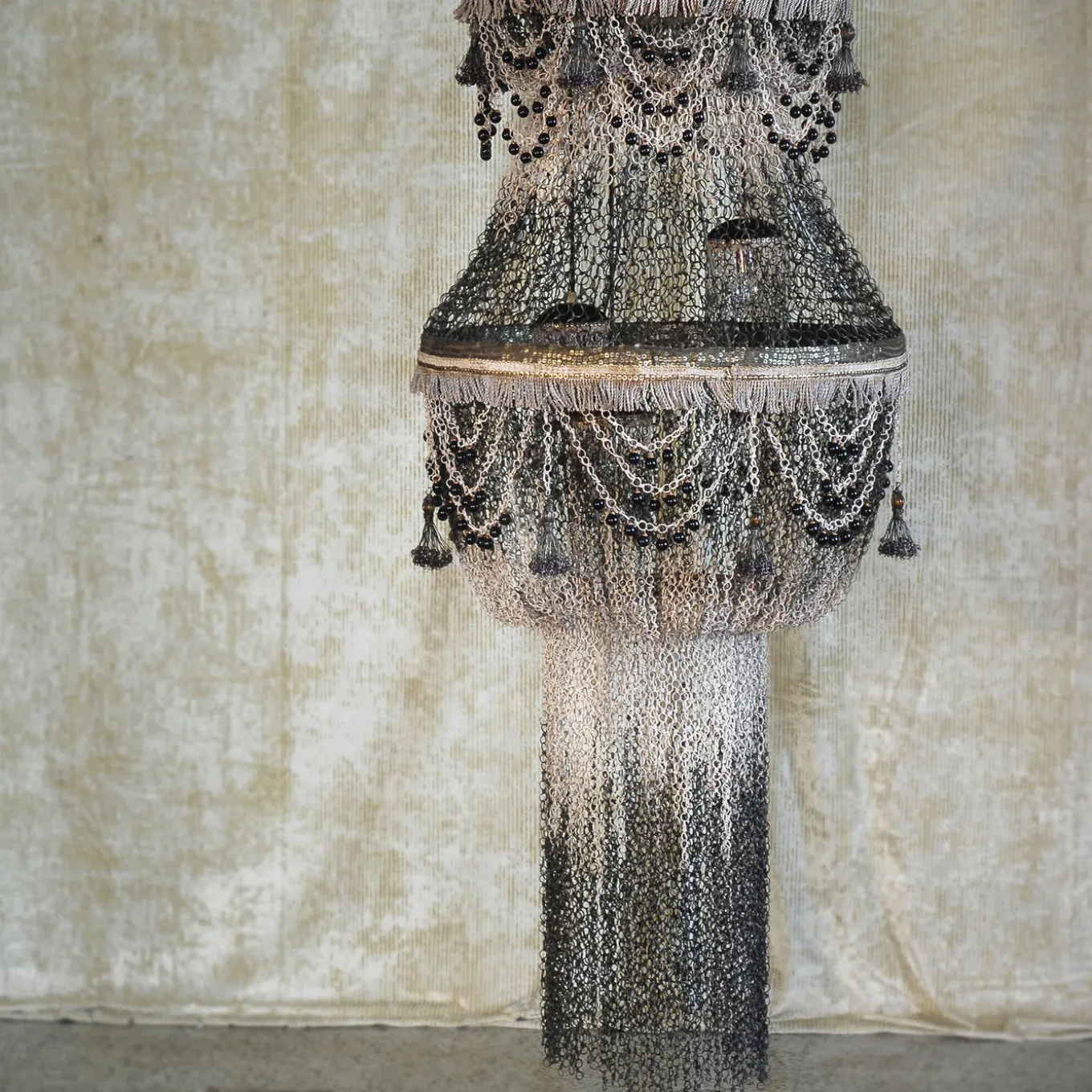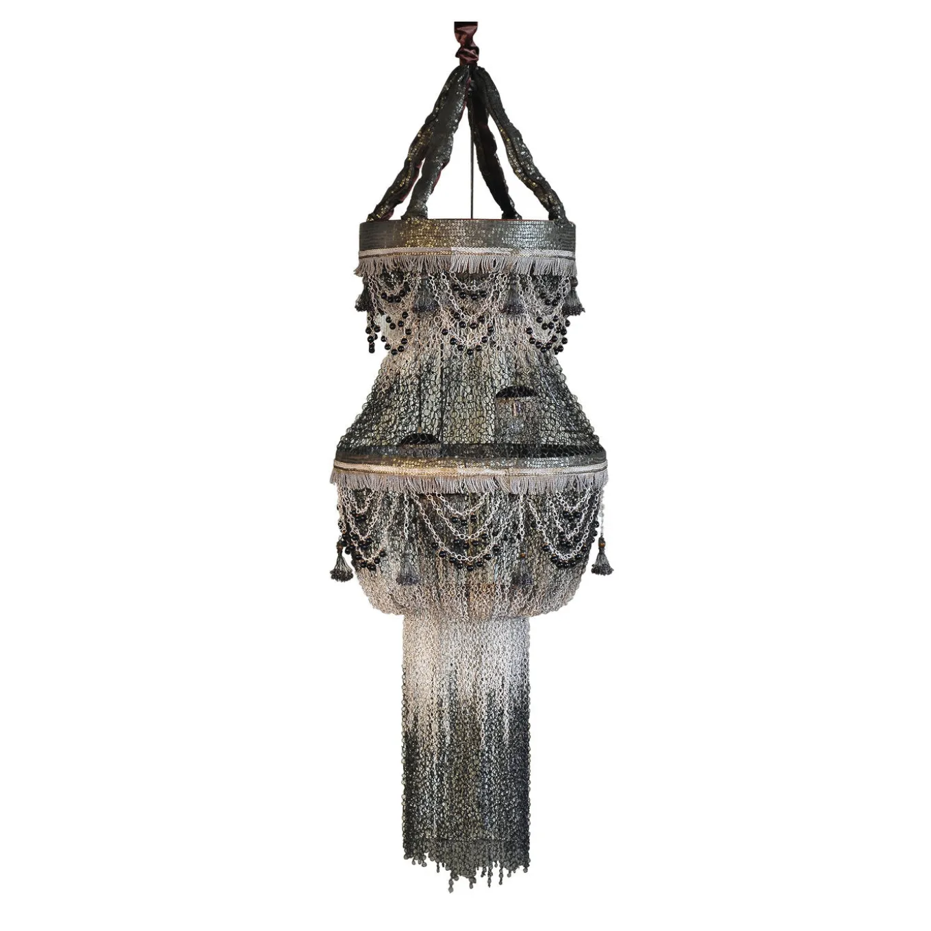 An intriguing dance of form and material, this striking empire chandelier is a modern take on an iconic piece of home decor. Introduced at Milan Design Week 2018, this chandelier is meticulously crafted of natural and painted iron, the two shade bands boasting striking sequin decorations in bronze and white with a lilac fabric trim. The iron-wrought large belcher chains, consisting of 10,000 knots, cascade down the chandelier in an eccentric black and light-pink gradient. Small spherical crystals accent the iron chains for a stunning color and textual contrast.