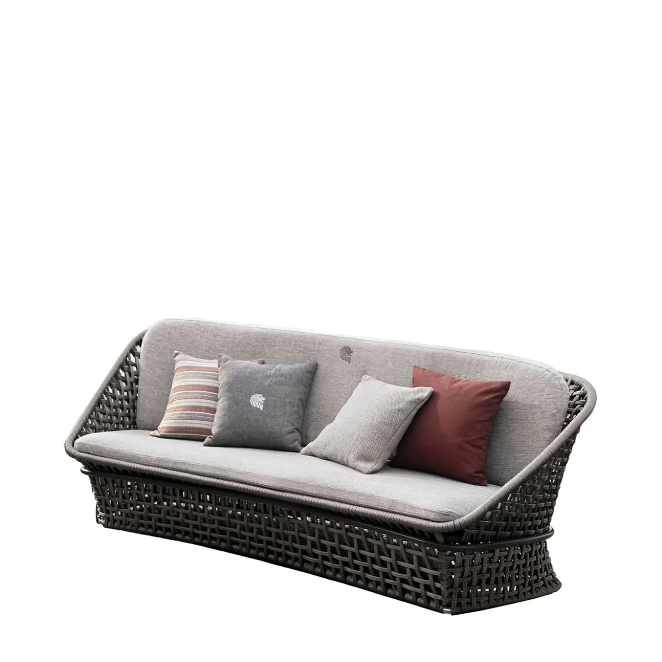 2 seater sofa available in specially treated fabric. Cushion filling in waterproof dacron. Structure in a combination of satin black metal treated in cataphoresis with inserted Giorgio Collection logo and black cordage. Special outdoor cover included in the price.