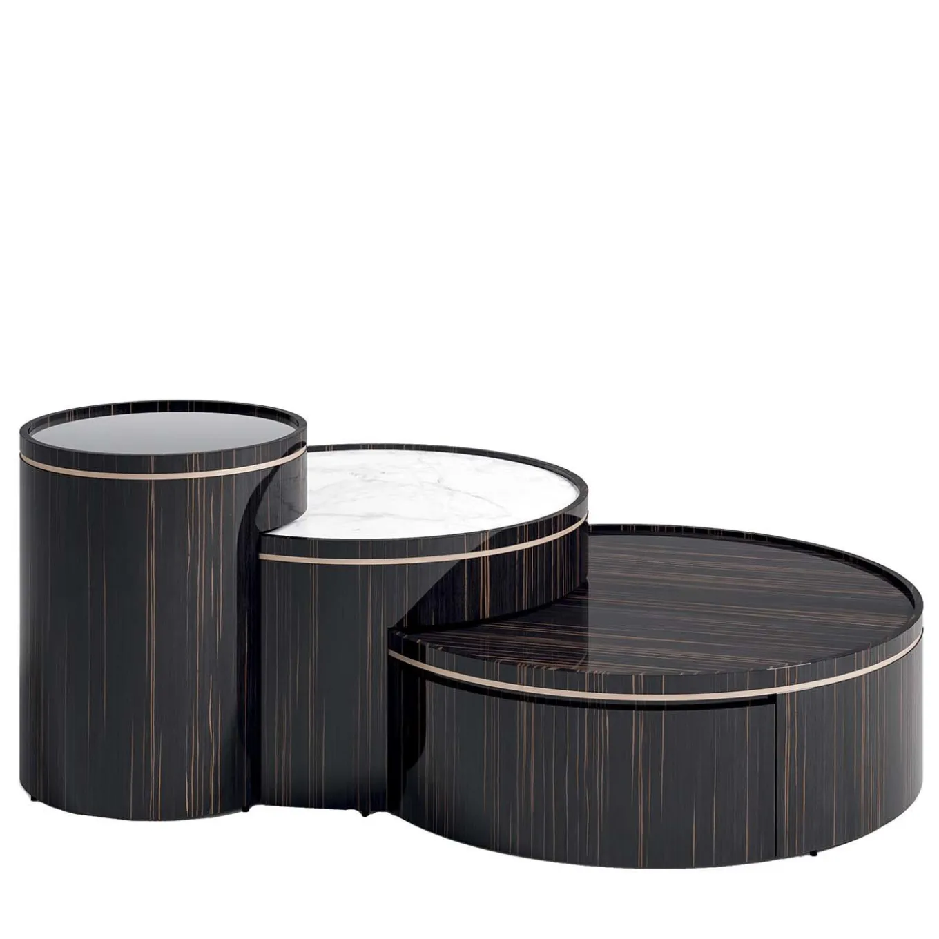 This stunning set of three tables is a versatile and precious addition to a modern interior. The wooden structure of each piece is finished in ebony with bright gold-finished metal details. Calvin is Ø 100 x H25 cm with ebony-finished wooden top and a drawer with push-pull opening internally lined in microfiber cloth. Carl is Ø 80 x H40 cm with top in Carrara marble. Clay is Ø 50 x H55 cm with a tinted mirrored top. The different finishes and glossy curved surfaces will lend a superb accent to a modern interior. Other finishes are available, please ask the Concierge for options.