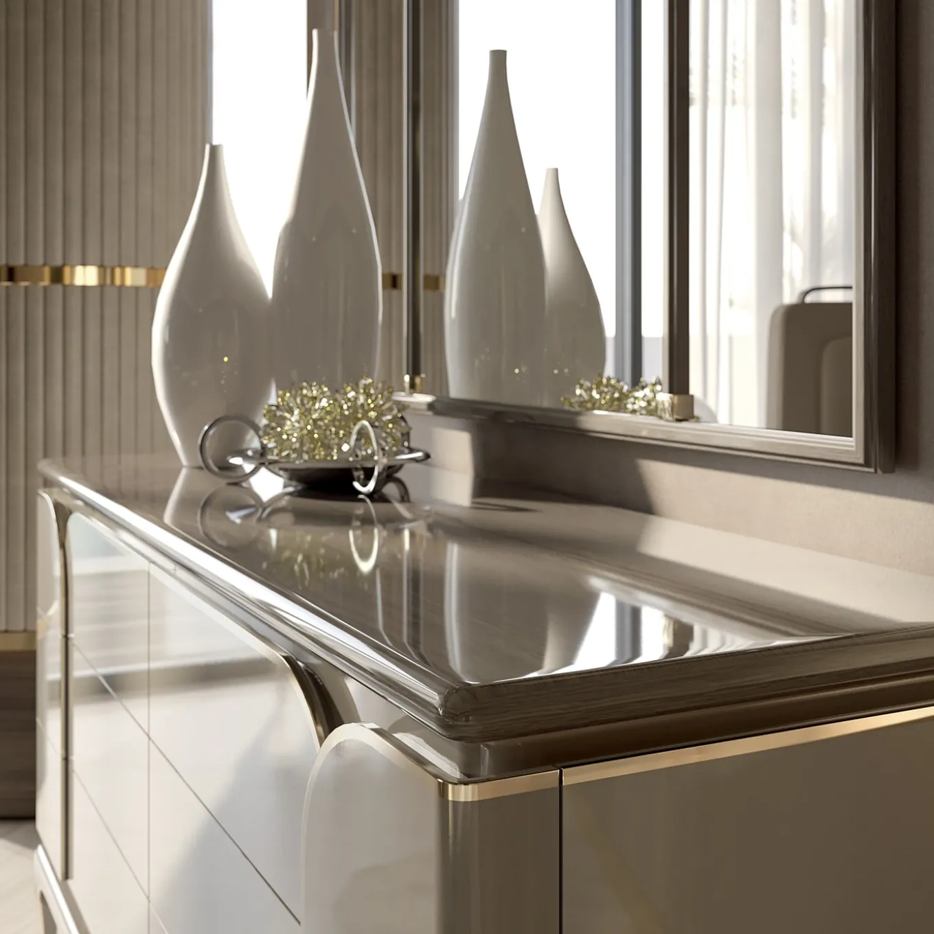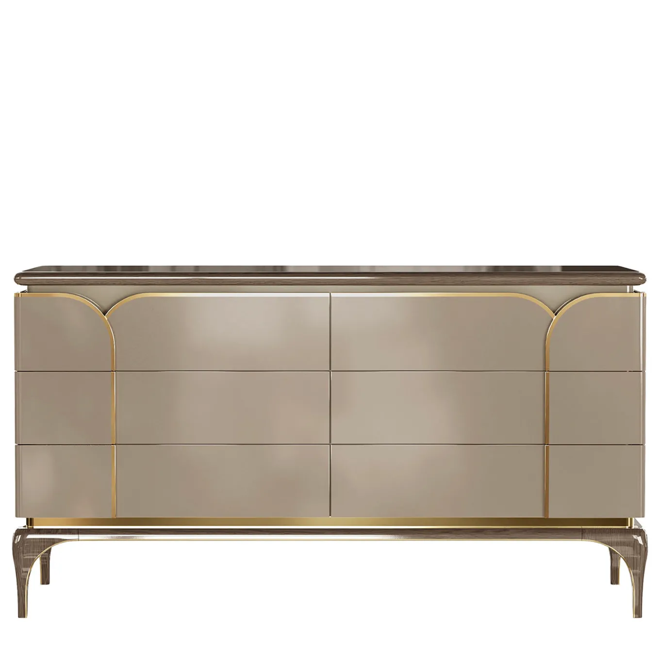 An ideal complement to a refined living room or dining room decor of modern sophistication, this stupendous dresser is deftly handcrafted of high-quality materials with minute attention to detail. Fashioned of lacquered and polished wood, it features four doors enriched with a sleek profile in gold-finished metal.