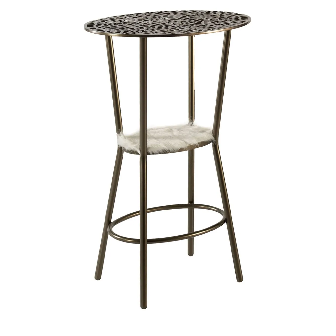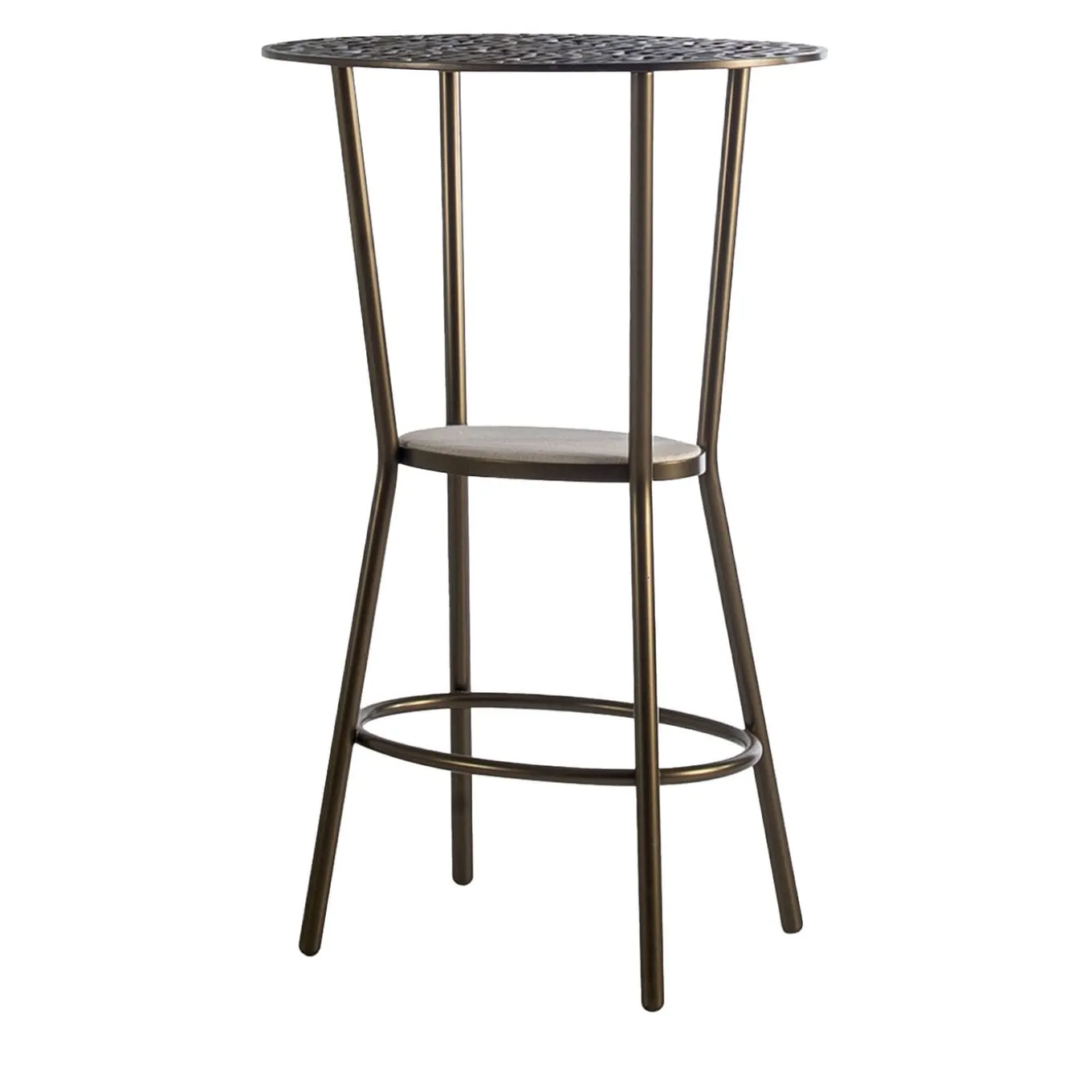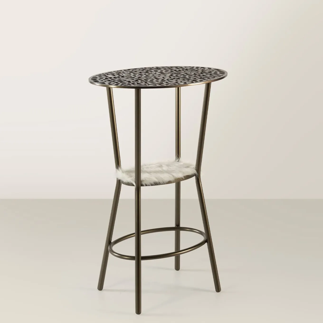 A testament to traditional artisanal craftsmanship combined with an elegant contemporary style, this stool or side table boasts a sleek and singular silhouette. Part of the ’70s Collection, it is fashioned of bronze powder paint-finished steel, and features a distinctive top made with melted aluminum. Completed with a lower top upholstered with white-beige fabric. Please consult the Concierge for further details.