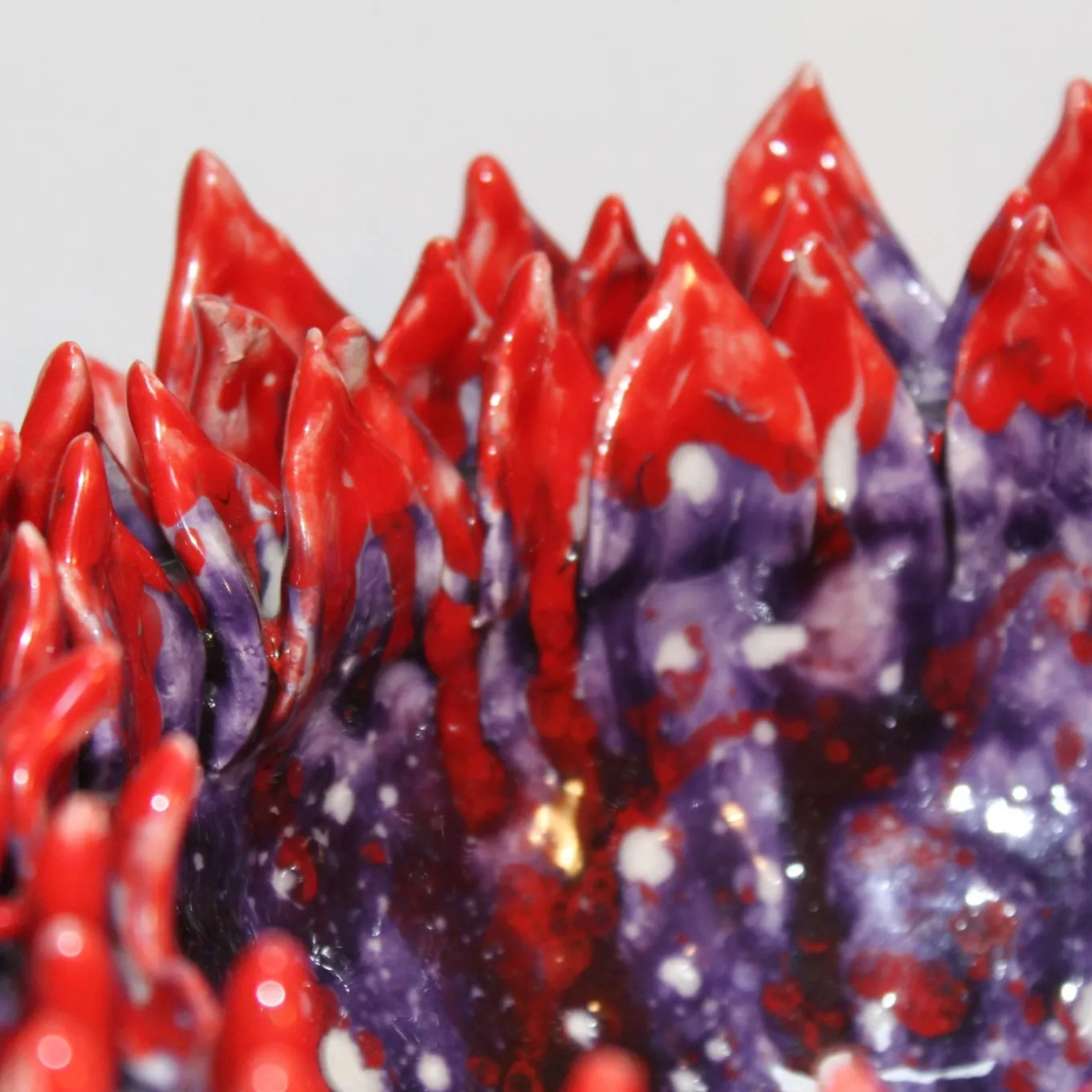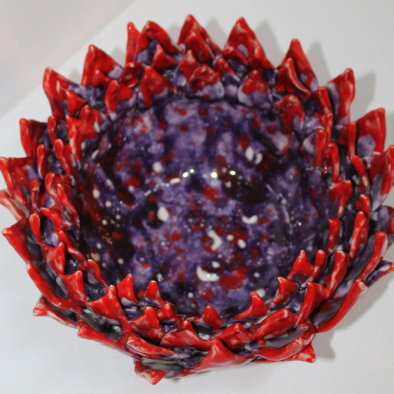 Acantha, from the Collection Cynara, serves as a striking decorative centerpiece, inspired by the untamed beauty of the artichoke and the Greek nymph associated with the plant realm. This piece epitomizes the harmonious blend of organic form and exceptional craftsmanship, transforming ceramic artistry into a vivid floral expression. Meticulously crafted from white clay, the vase showcases a sculptural structure that closely resembles the pointed bracts of a blossoming artichoke. The crystal glazing technique enriches the surface with a captivating interplay of color and texture. The intense red exterior ignites the tips of the spiky edges, producing a vibrant, fiery effect, while the interior reveals deep shades of purple interspersed with splashes of white, reflecting the plant’s hidden essence. The glossy and irregular surfaces amplify the sense of movement, ensuring that each angle presents a unique perspective. Each piece is unique, due to handcrafting, slight changes may occur.