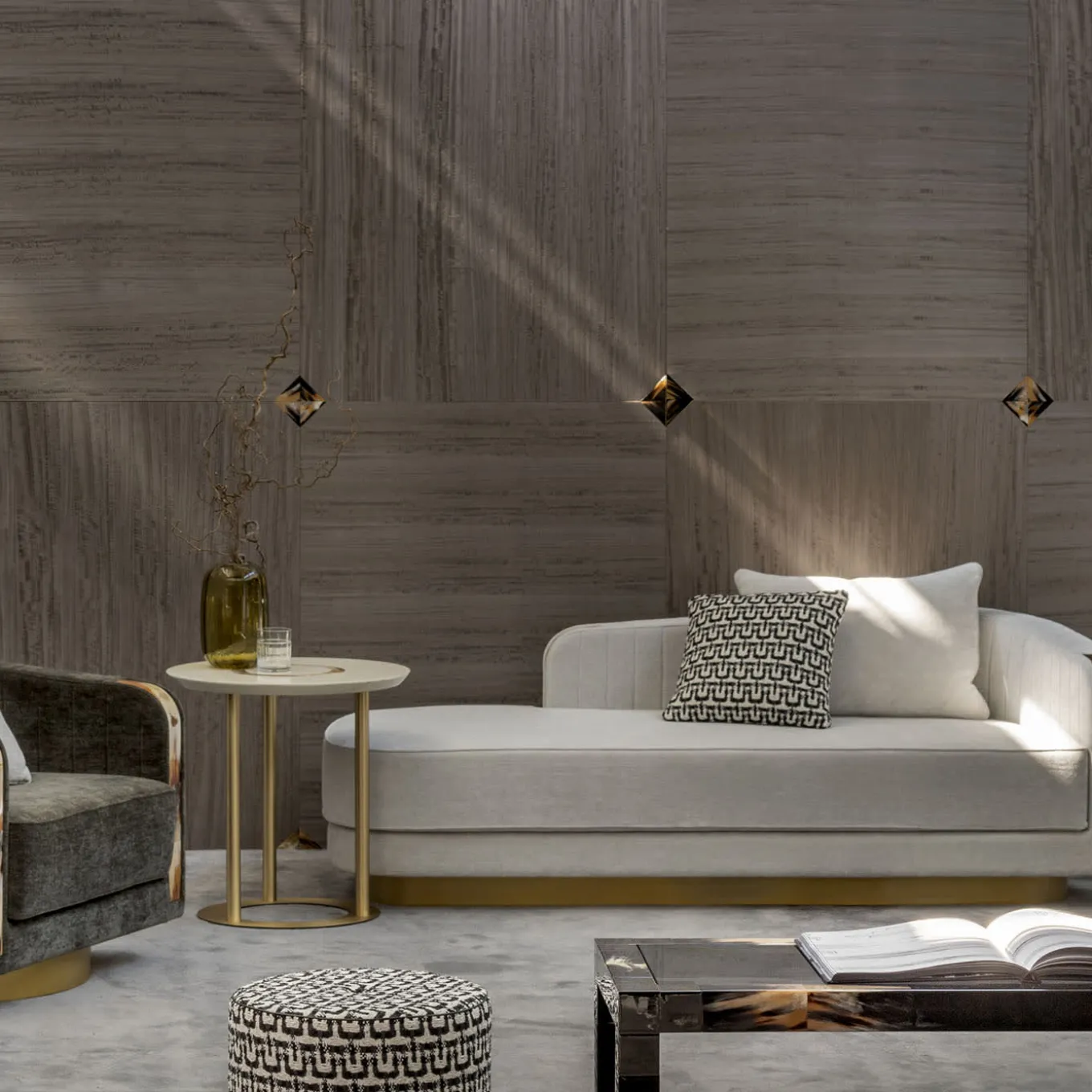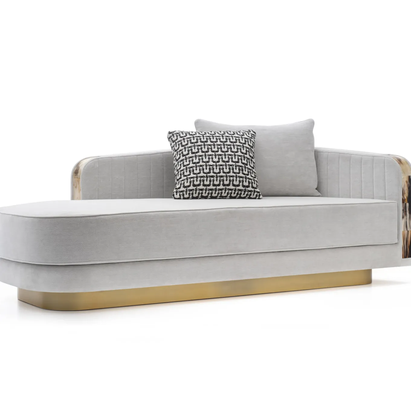 An exceptionally stylish design by Filippo Dini provides the Afrodite Chaise Longue with an unsurpassed elegance. The seat features curved armrests with horn inserts and a wooden base with satin brass effect, a ribbed back and armrests and quality padding in polyurethane foam, goose down and memory foam. Measurments are 200 x 95 x H 86 cm.