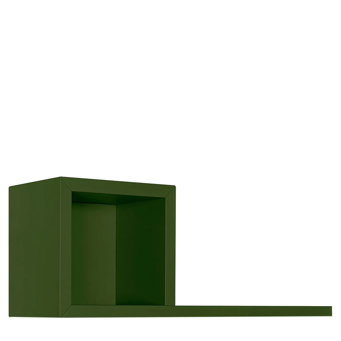 Minimalism and dynamism unexpectedly merge in this shelf by Alan Cornolti. Conceived to be positioned as desired, it features a clean structure obtained by assembling MDF panels (3cm-thick) lacquered in matte-green and finished with a textured feel. Books can be both neatly organized in the cubic open unit or freely arranged on the mere horizontal element. Retractable hooks allow for a steady yet discreet anchoring. Also available with the box on the right and in different colors, please contact the Concierge for further information.