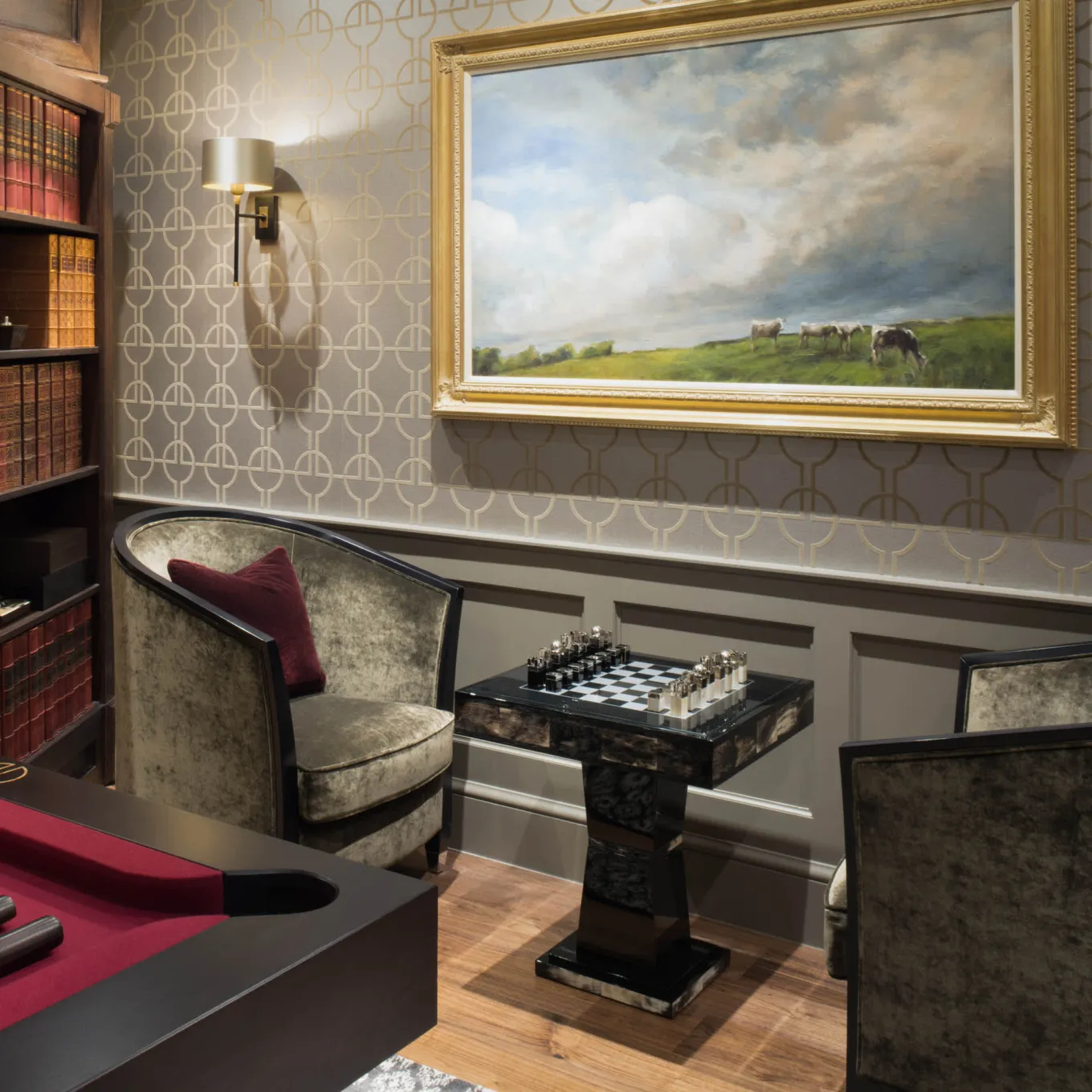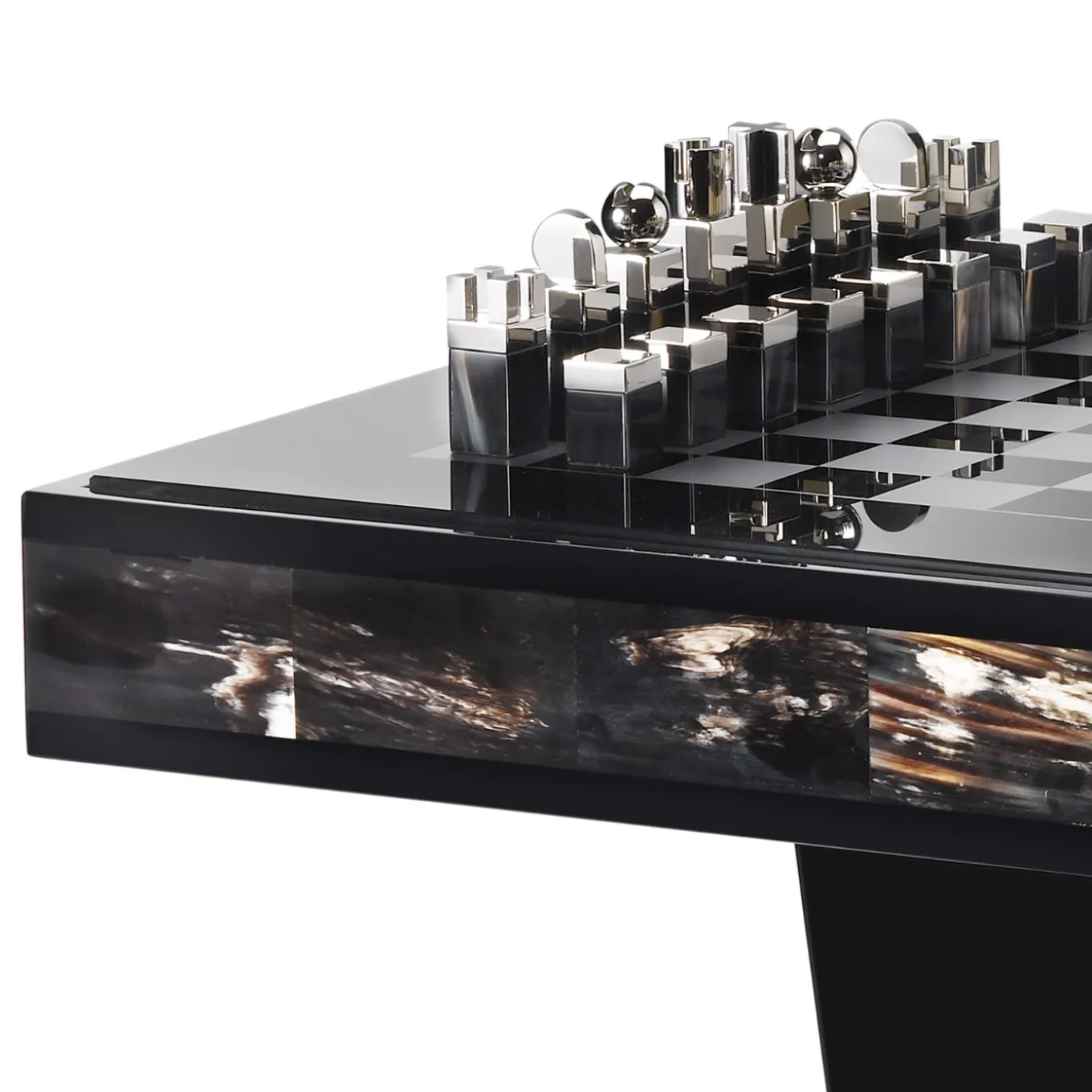 This stunning Alfio Chess Table is crafted in dark horn and black lacquered wood and features a top in smoked tempered glass with a silver chessboard design. The splendid chessboard pieces are made from horn and palladium plated brass. Designed by Arcahorn, the table measures 55 x 55 cm and is 60 cm in height.