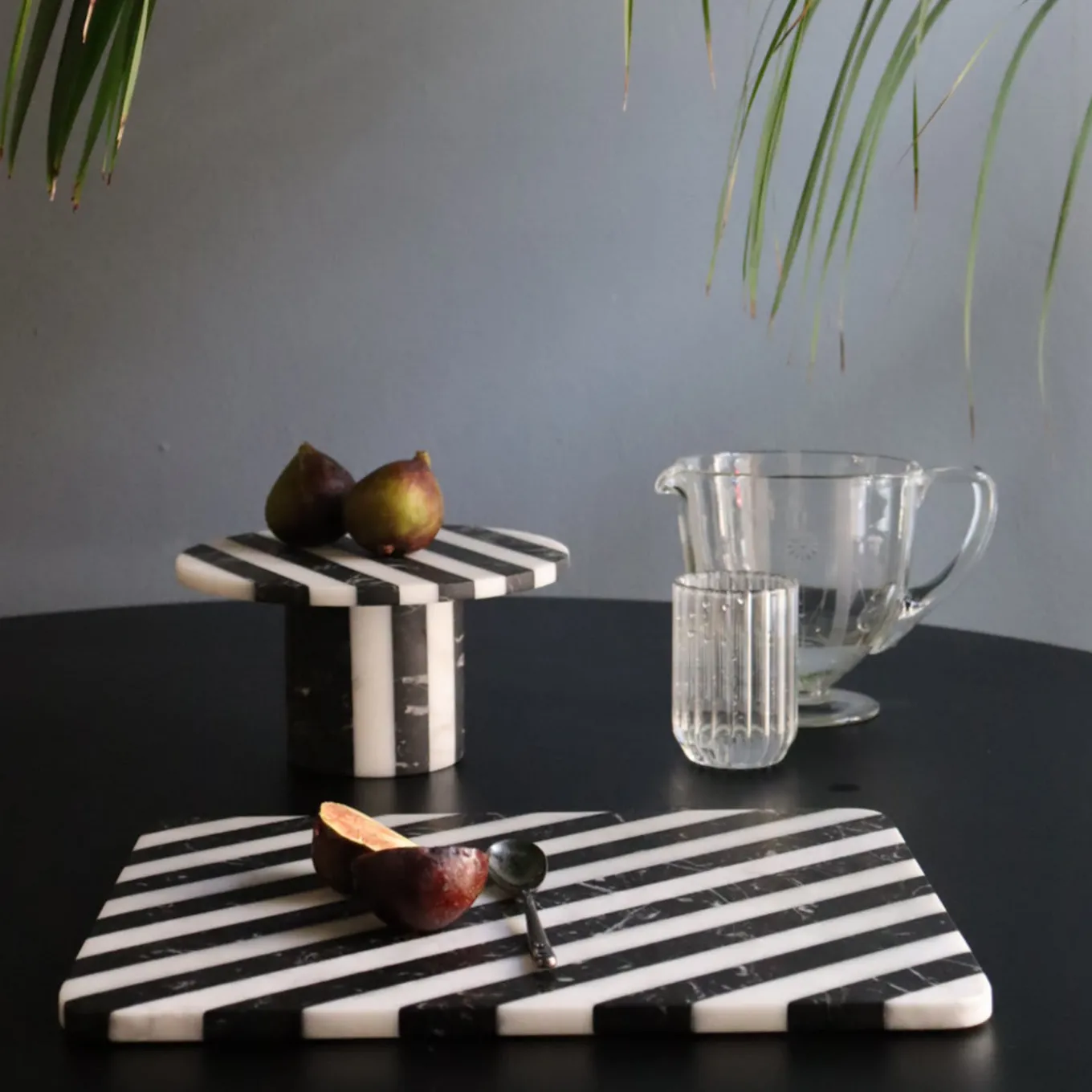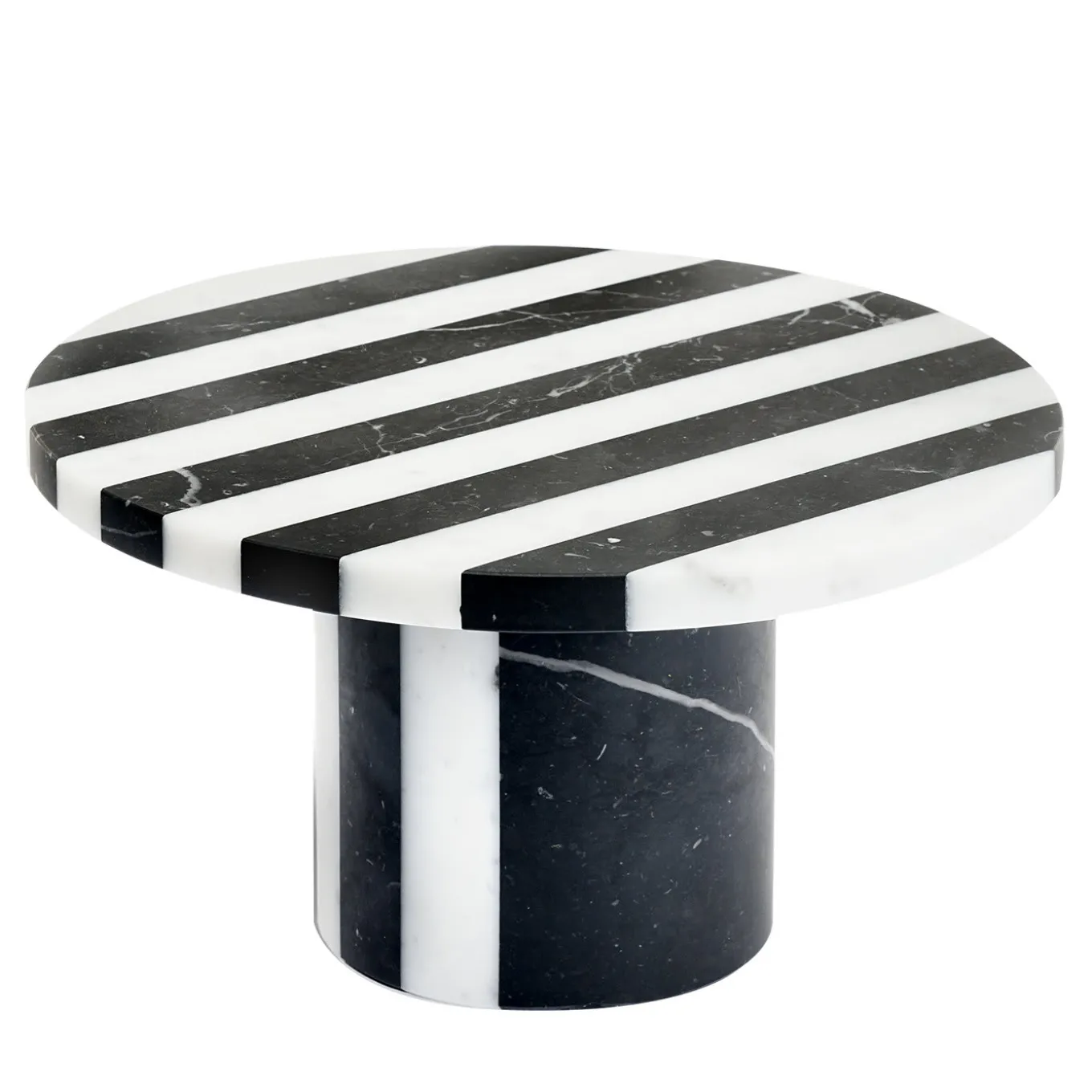 Envisioned and designed by Welsh artist Bethan Gray, this unconventional cake stand will be a bold accent piece in a kitchen or dining room decor. Inspired by ancient European stone architecture, the tall silhouette is handcrafted of white Arabescato and black Marquina marbles, the solid cylindrical base and flat circular top enhancing the alluring striped pattern. Used to display homemade cakes or seasonal fruits, this piece is will make a lovely housewarming present for loved ones.