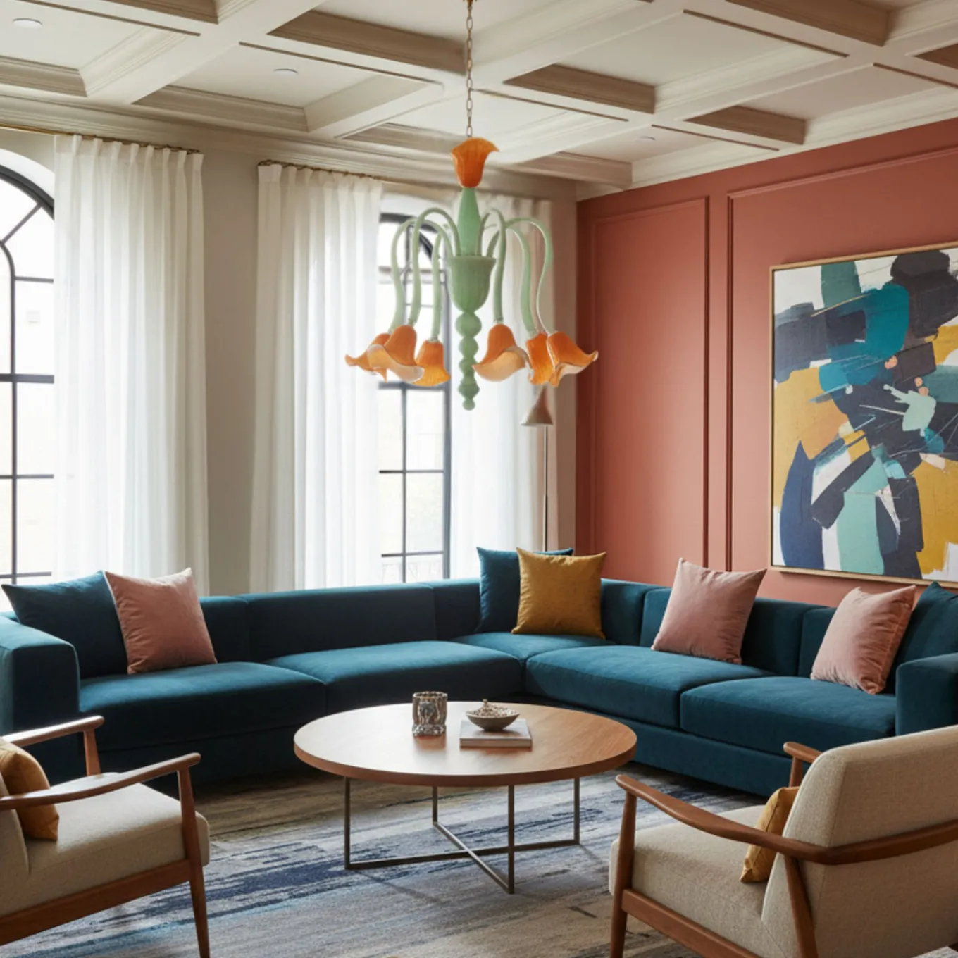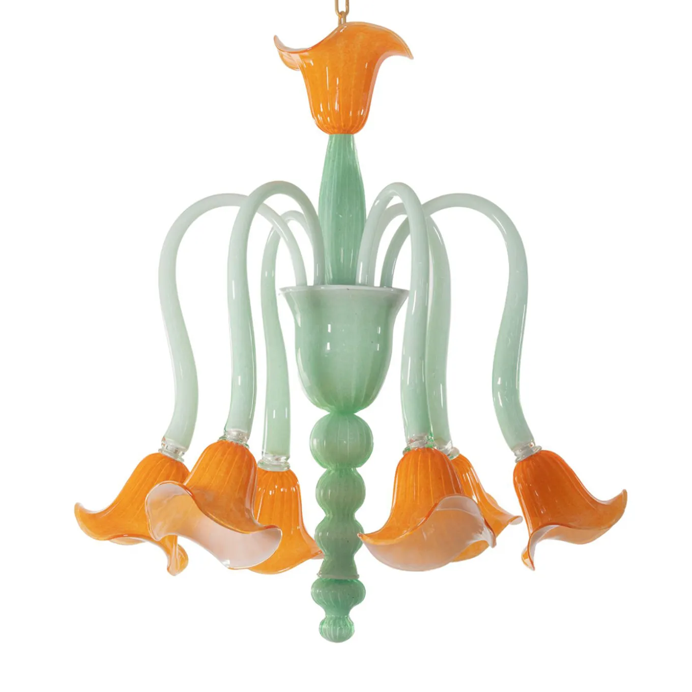 The Alnitak Floral chandelier features a striking design blending soft green and vibrant orange tones, inspired by the Cleo model. With a substantial height and diameter of 80 cm, it creates a warm, inviting atmosphere while commanding attention in any space. Its balanced proportions and elegant curves make it ideal for enhancing contemporary interiors, with customizable color and size options available to suit diverse design needs. Finished in brass for added sophistication.