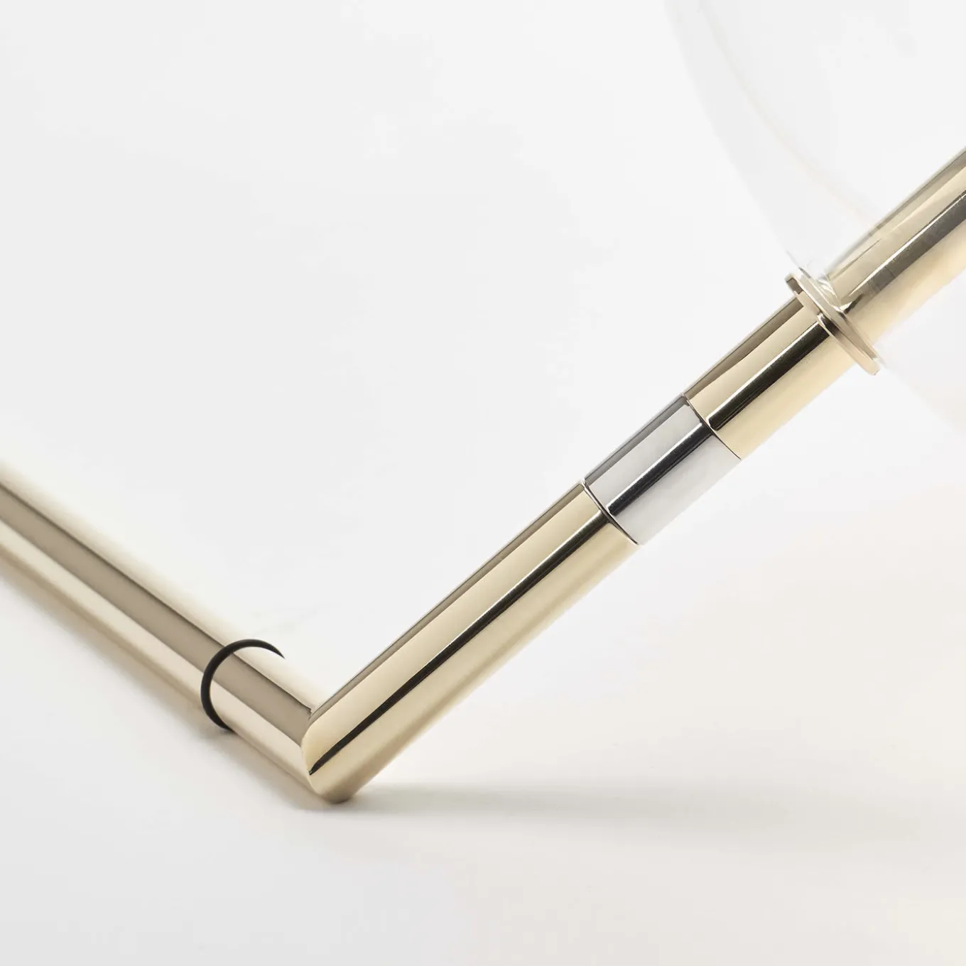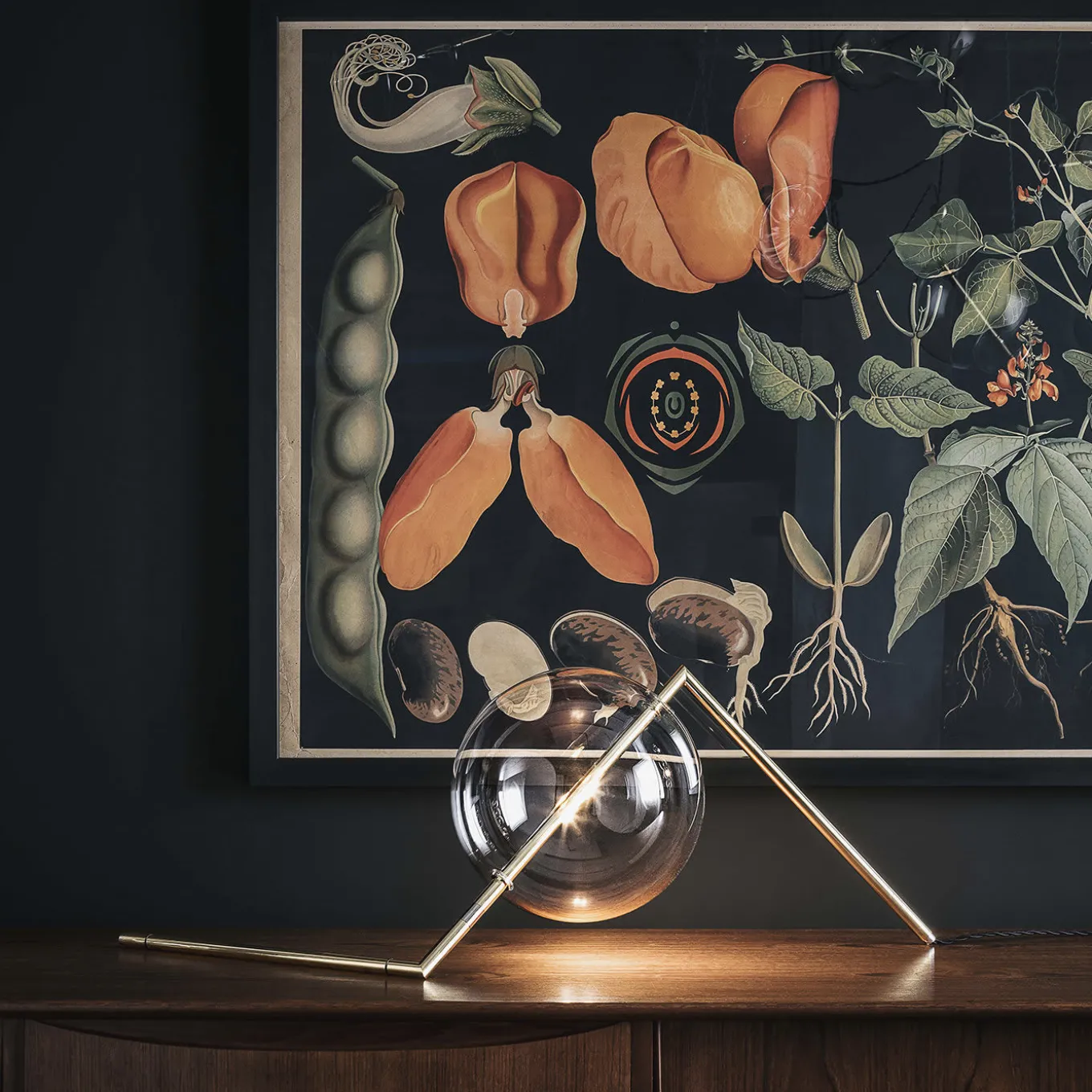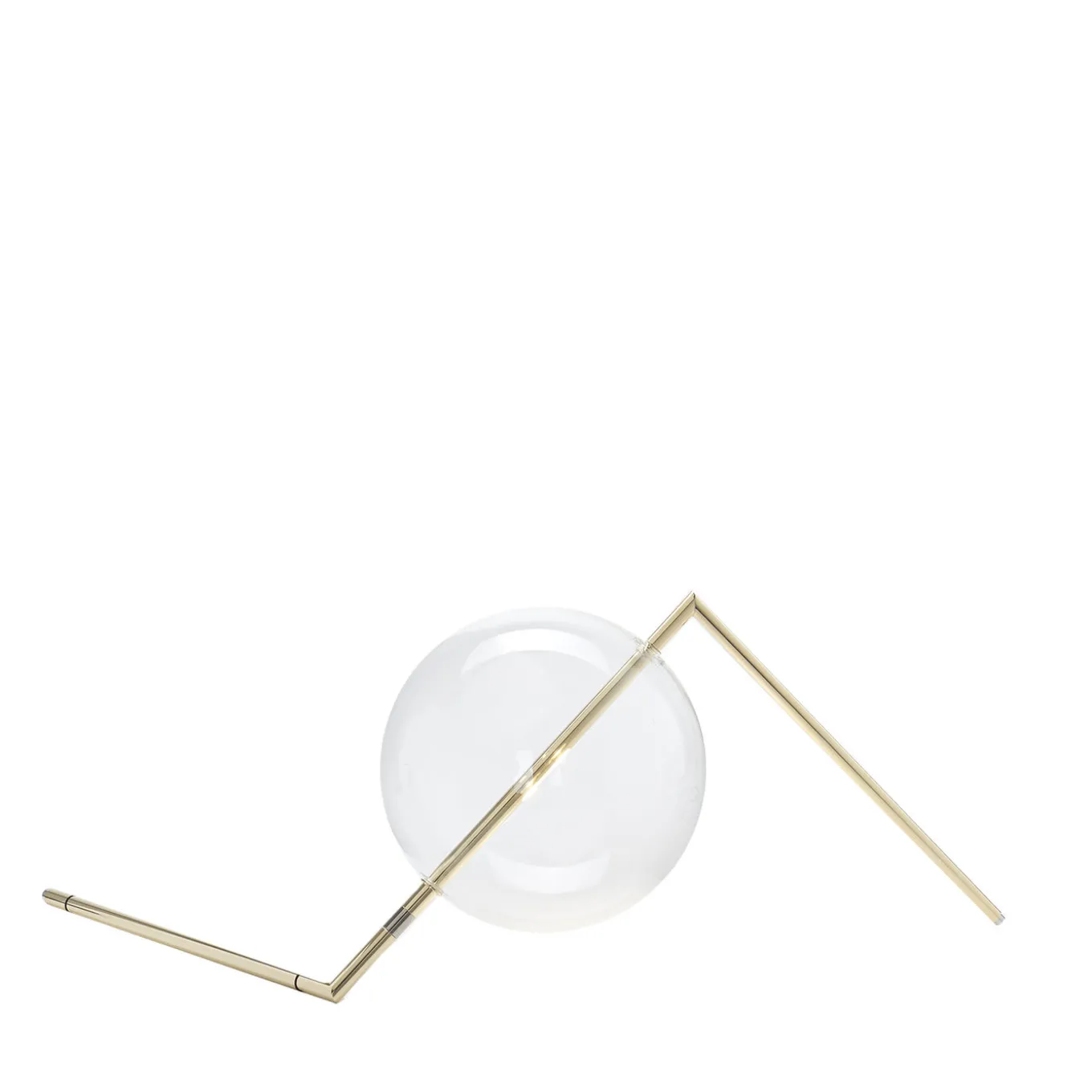 This unique and exquisite lamp was created to be positioned specifically on a console table, making it a perfect surface to display this piece of functional art. The sphere is made of mouth-blown borosilicate glass, pierced by a brass straight element, part of a striking structure that can be adjusted thanks to the nickel ring. The brass is brushed with a wax coating to slow down the natural oxidation process, thus creating an alluring finish that ages gracefully over time. The light can be dimmed thanks to the Inline Touch Dimmer. The lightbulb is 24V LED with 6W (equivalent of a traditional 40W), 400 lumens, 2700K. Transformer included.
