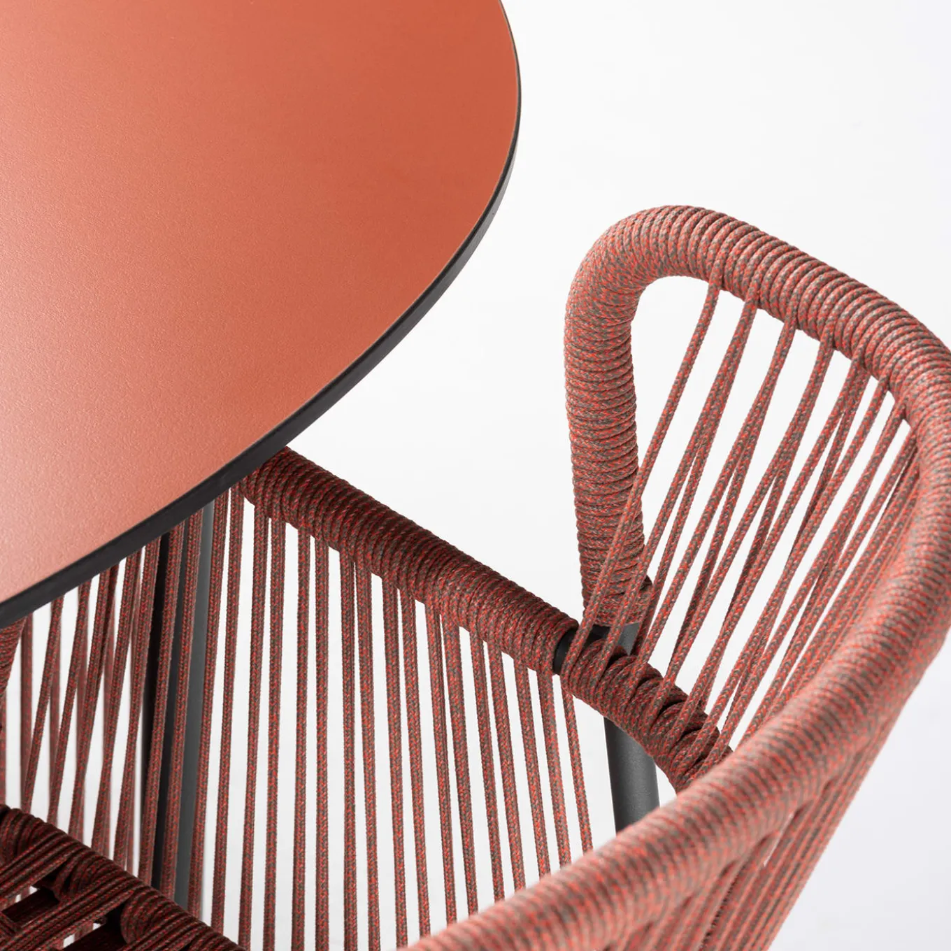 Ideally gathered with twins around the gray round Altana table for a coherent look, this armchair synthesizes comfort and femininity. Dynamic lines, also incorporating the embracing backrest and linear armrests, trace the profile of its anthracite-powder-coated steel frame, which boasts a seductive openwork design of hand-woven nautical pink ropes. It is safe for outdoor use.