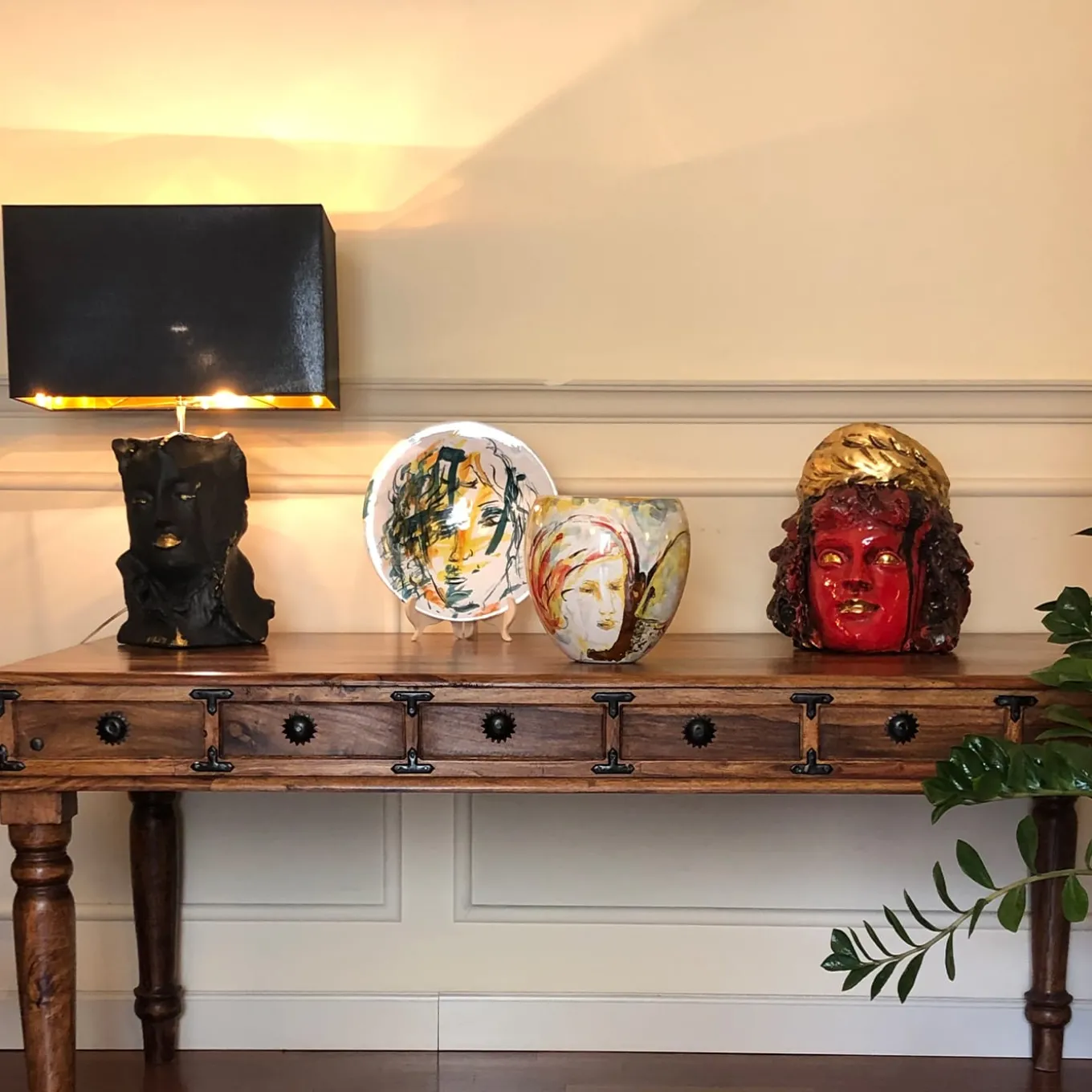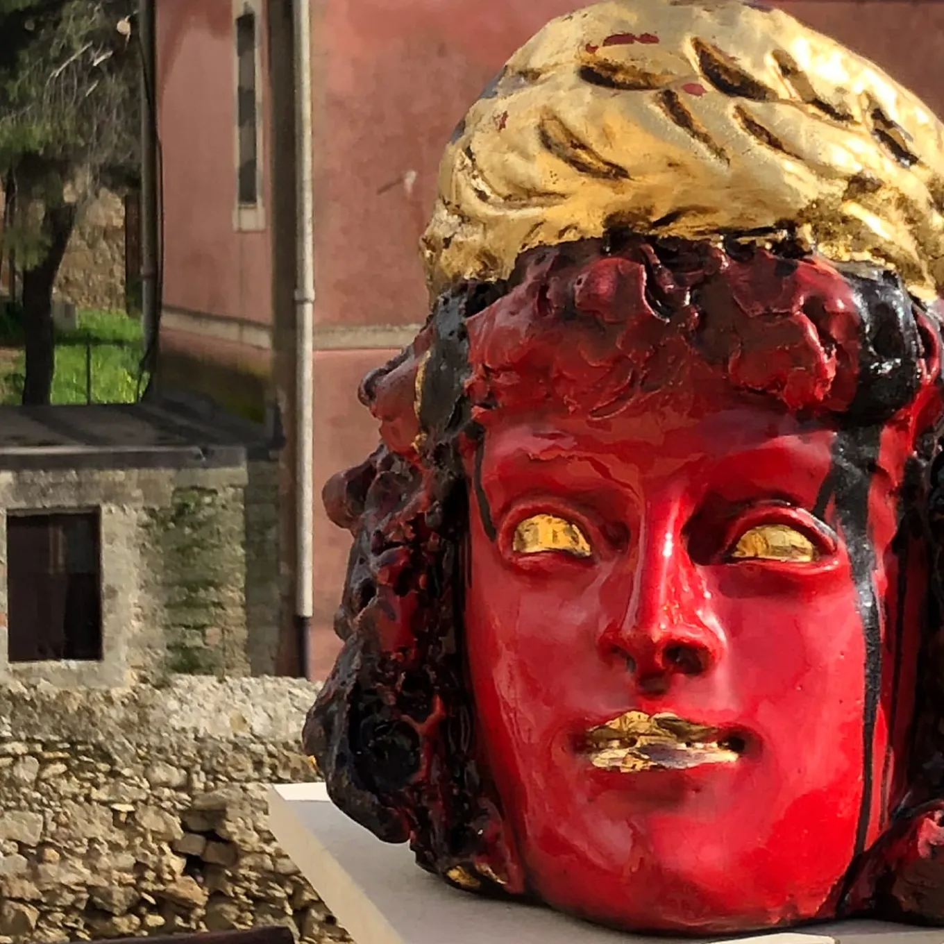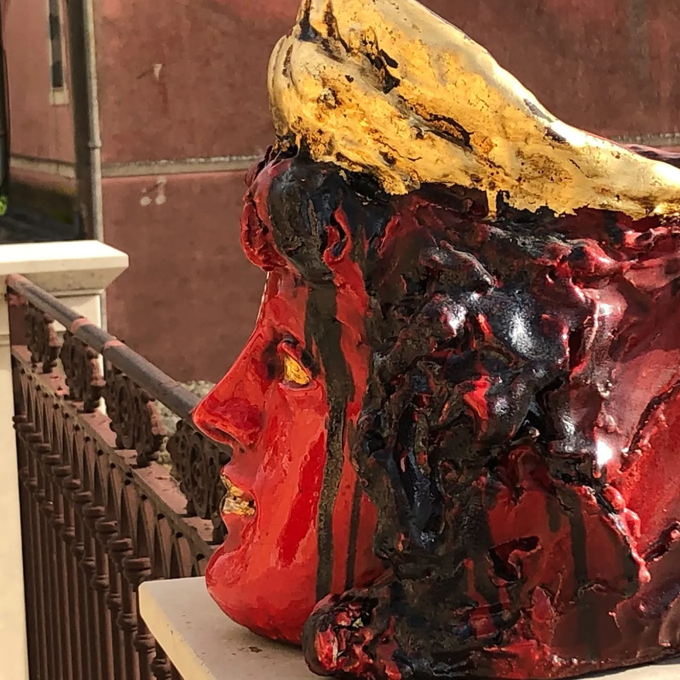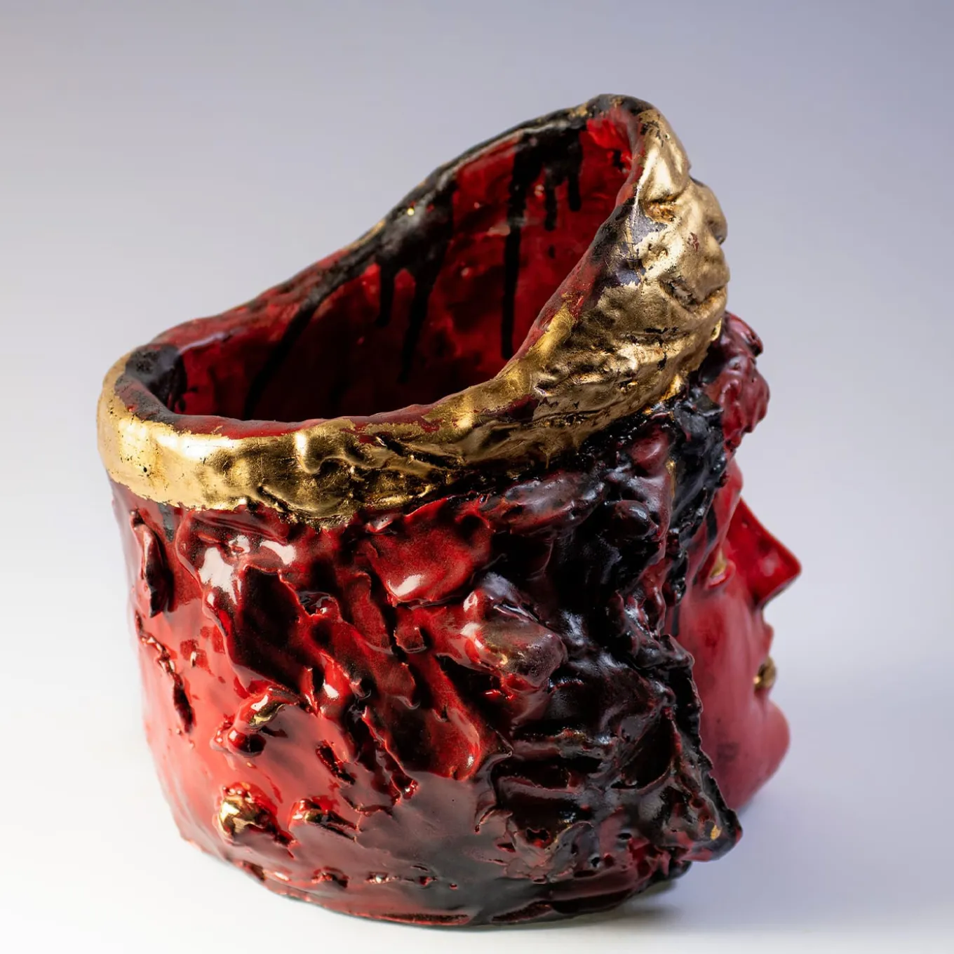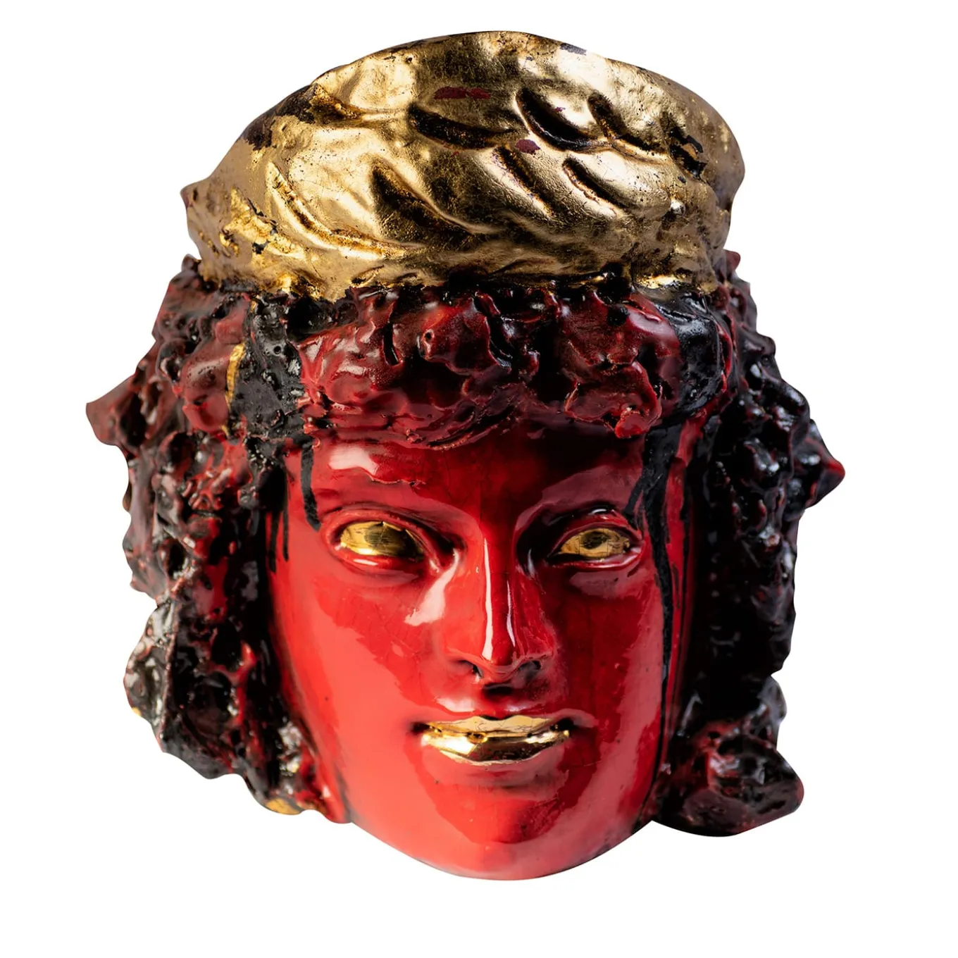 Princess Angelica from the medieval poem ‘Orlando In Love’ inspired the anthropomorphic design of this vase, minutely handcrafted by Angelo Salemi and stunningly glazed in red with accents of black glaze dripping on the hair. Pure gold adorns the eyes and mouth while shimmering gold-leaf is applied to her tiara. Part of a set, this extraordinary piece cannot be sold separately and must be purchased with its male counterpart Orlando, please see the Artemest catalog for details.