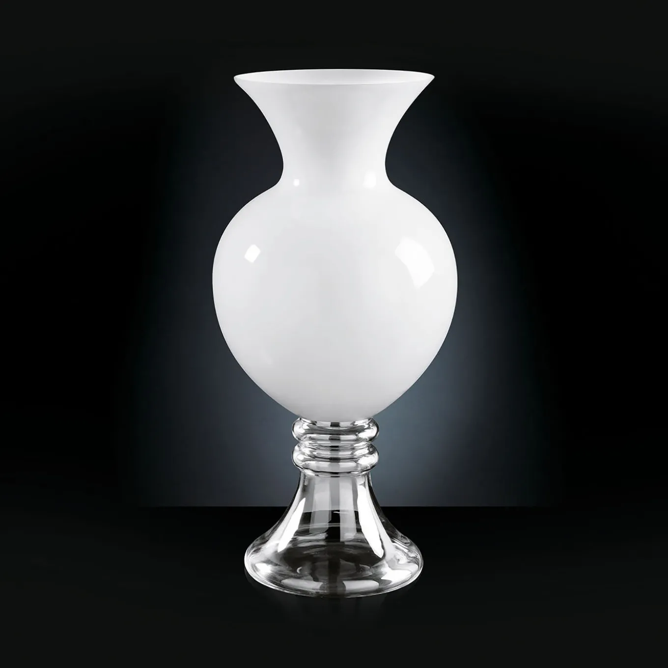 A splendid showcase of craftsmanship, this stunning, luminous vase is reminiscent of the classic silhouette of an amphora. It is composed of a bell-shaped base fashioned of clear glass, and elegantly contrasting the white opaque glass of the round and capacious body. The top with flared rims recalls the bell shape of the base.