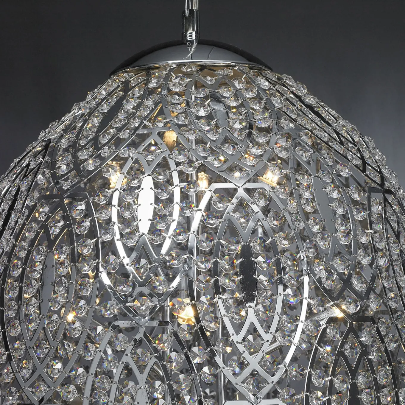 Pendant lamp with an egg shape, characterized by a modern and eclectic design. Made of a structure in steel links and faceted crystals manually applied.