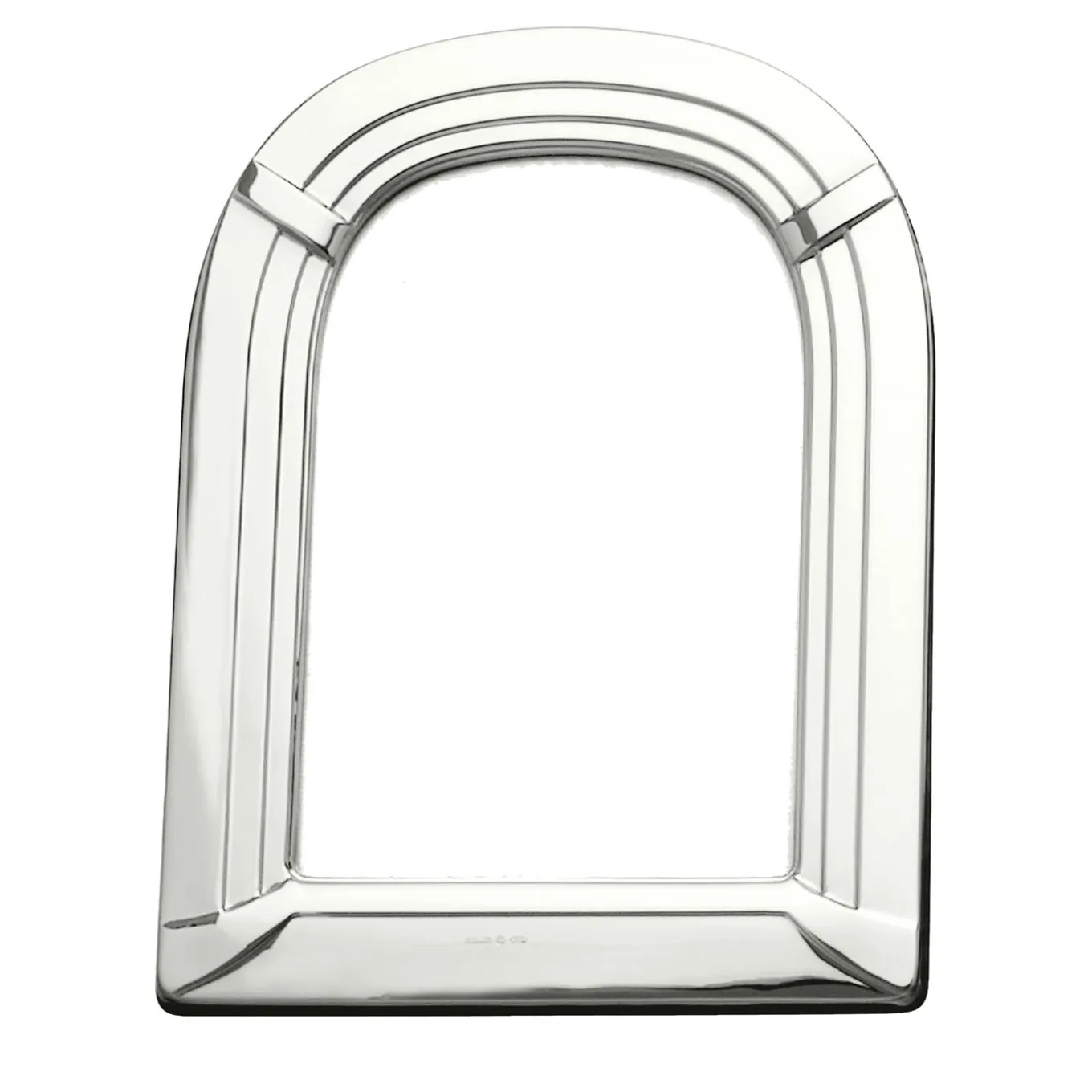Timeless materials and simple elegance are what this 925 sterling silver frame is all about. Put all your pictures on display with this arched frame with simple detailing in the corners, backing in mahogany, and moiré fabric lining. This piece has extra-thick glass and comes in two sizes: 13 x 18 cm or 18 x 24 cm.