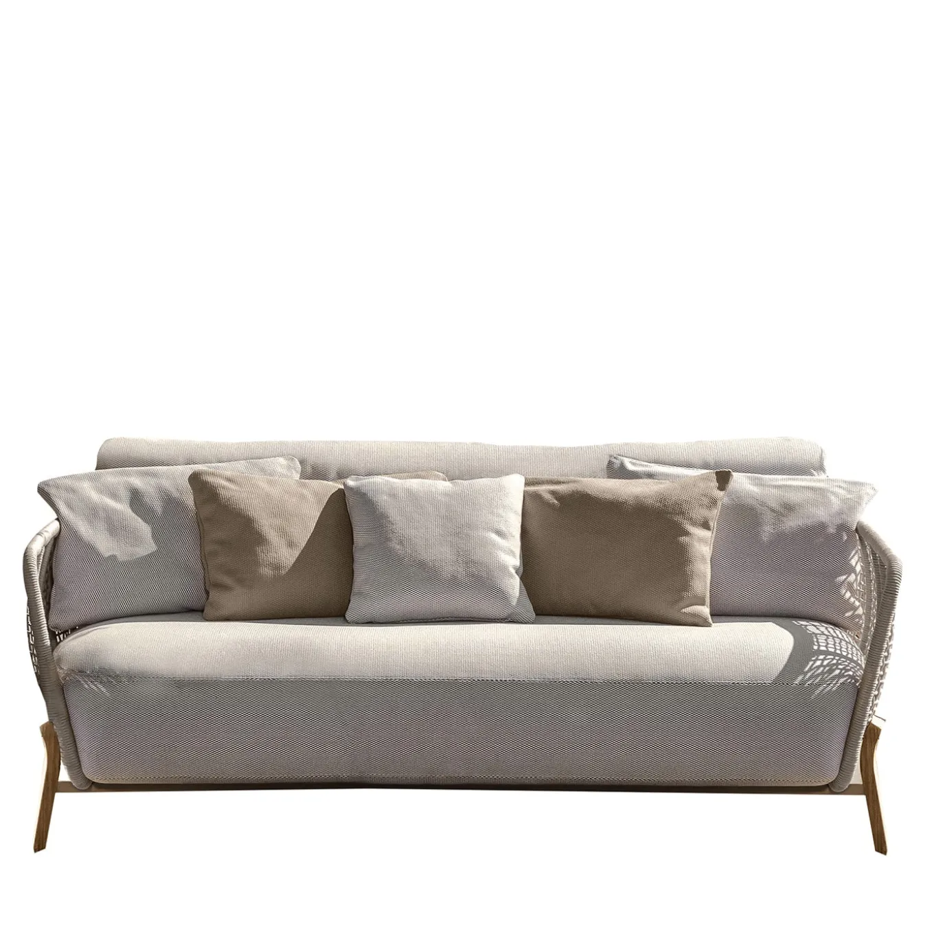 Loveseats suggest intimacy, and this design from the Argo series was designed to emphasize that feeling with a fully-enveloping shell adorned with an airy openwork design. Raised on curved teak feet, the structure features back and seat cushions generously stuffed and finally wrapped in beige-toned fabric. Decorative cushions are not included. Additional color options can be found in the Artemest catalog.