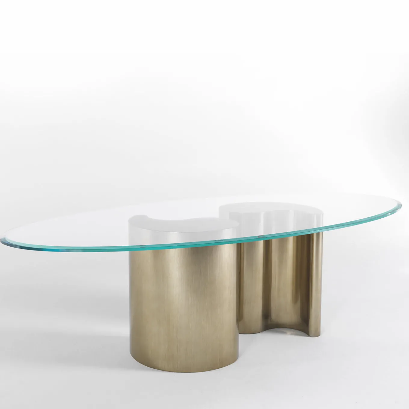 A double base with two ‘yin and yang’ sculptural elements is the main feature of Arp dining table. With its precious top in extra clear beveled glass, Arp dining table is an evocative, bright and refined element with a spiritual and symbolic charm. Bases in patinated gold liquid metal lacquered wood. Top in extra clear beveled glass. Please contact the Concierge to request the bronze glass variant.