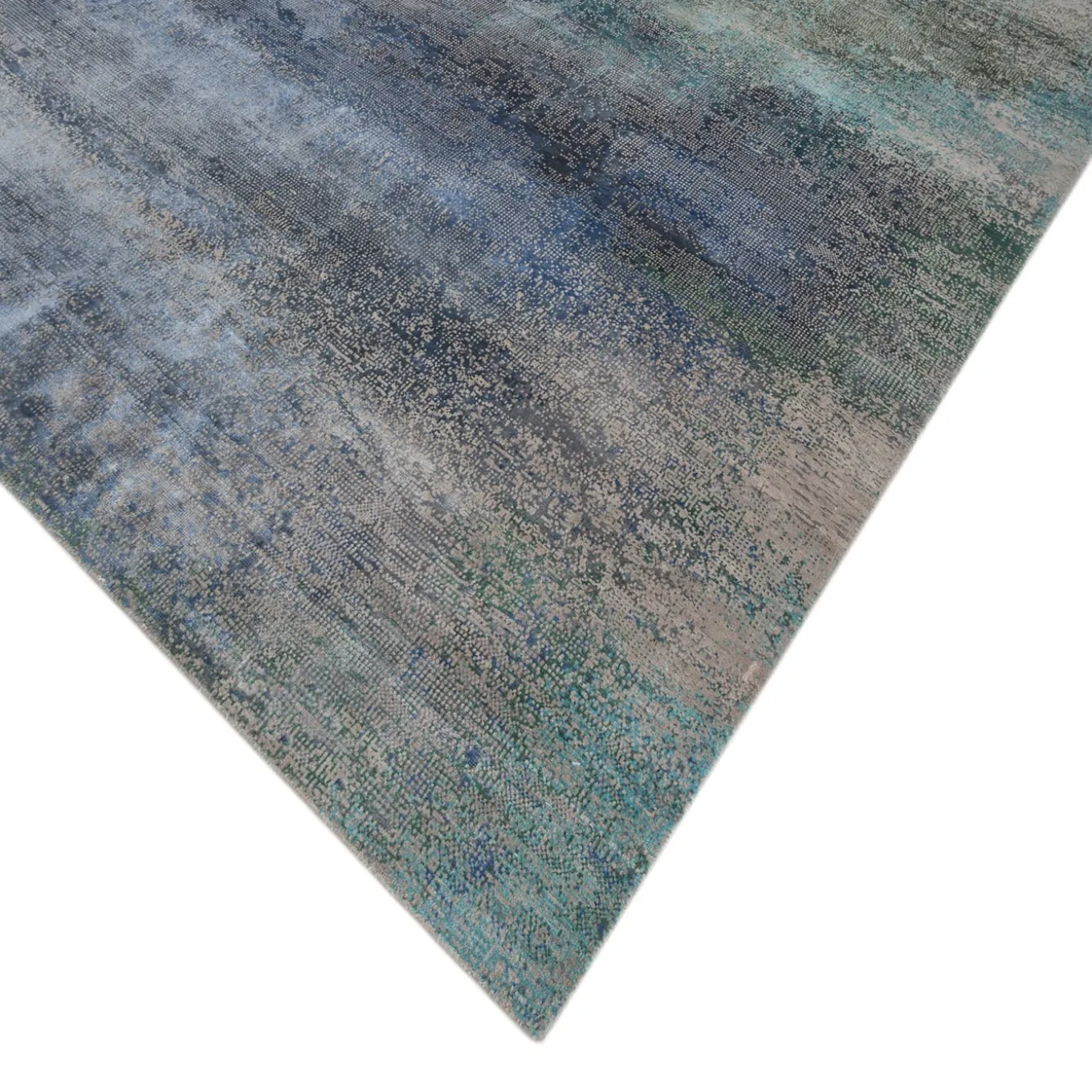This hand-knotted rug in Ashwood and Denim Ash captures the interplay of light and shadow. Woven by Indian artisans from bamboo silk, wool, and cotton, its painterly softness and intricate details create depth and dimension. The design of the rug invites both close introspection and sweeping admiration—one moment, drawn into its delicate textures. Every shade and contour carries the quiet resonance of craftsmanship, leaving behind a lingering afterglow of