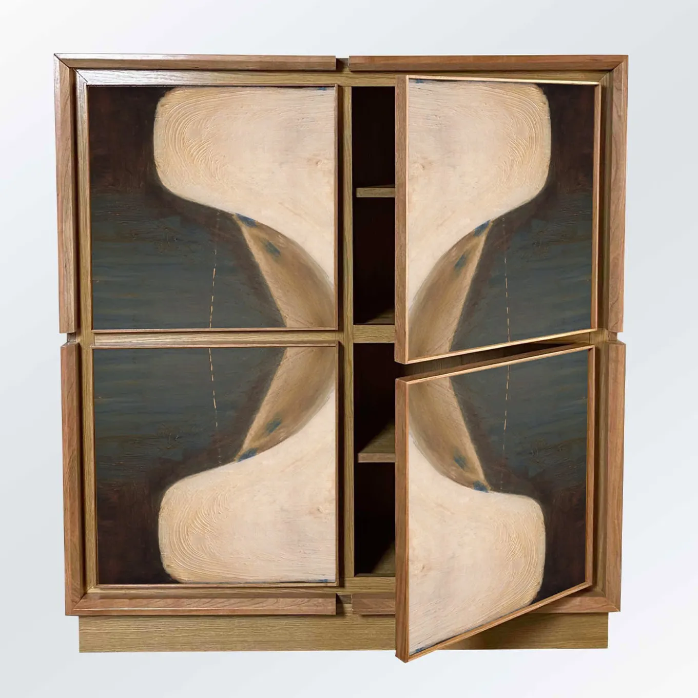 The Astratta Tre cabinet by Mascia Meccani is a singular design that merges art and craftsmanship into a striking handmade piece. Part of a limited edition of 10 numbered designs created in 2022, it is painted by hand with an abstract decoration that draws inspiration from Ferdinando Meccani’s oil paintings from the ’60s and ’70s. Handcrafted of durmast finished in cherry and walnut, it is customizable in wood essence and size upon request to the Concierge.