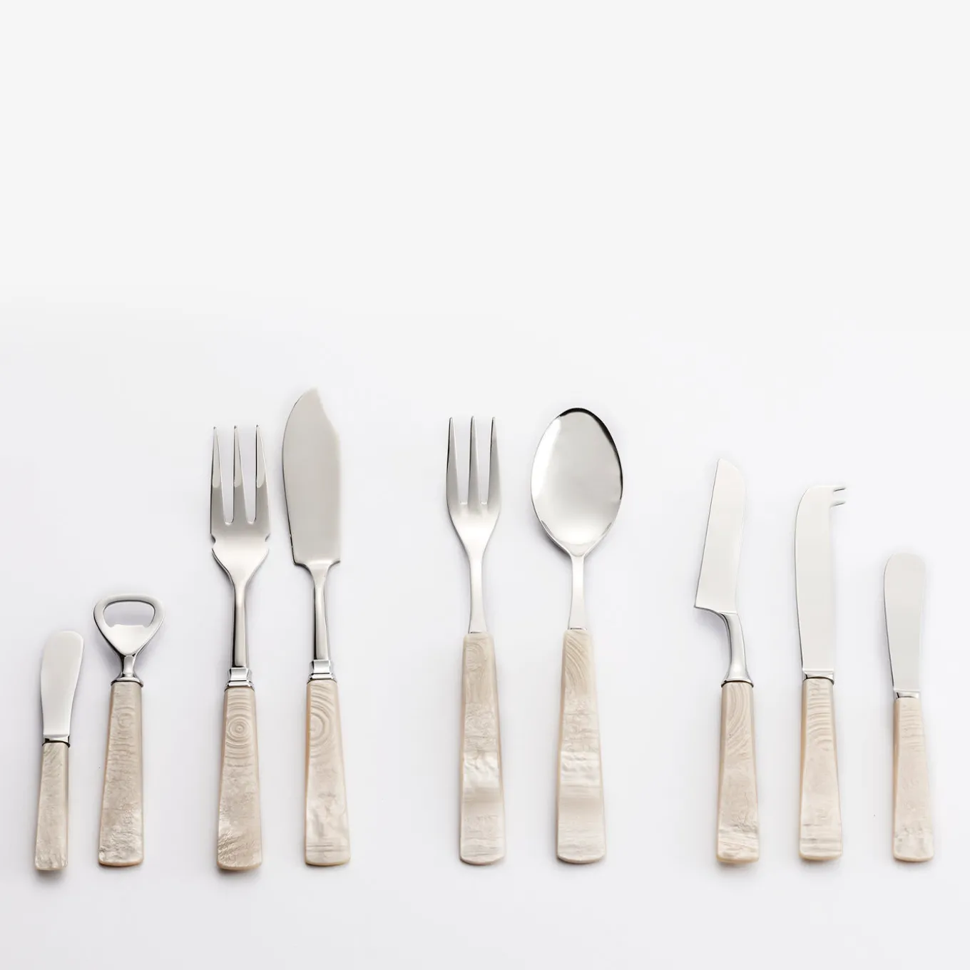 A refined addition to a personal collection or delightful housewarming gift, this set synthesizes sustainability and glamorous organic flair. The handles are fashioned of plant-based certified sustainable resin, showcasing an alluring nacre-like appearance rich in realistic textural and shading details. The stainless steel upper enhances the general luminosity with its glistening, mirrored finish delivering pure elegance.