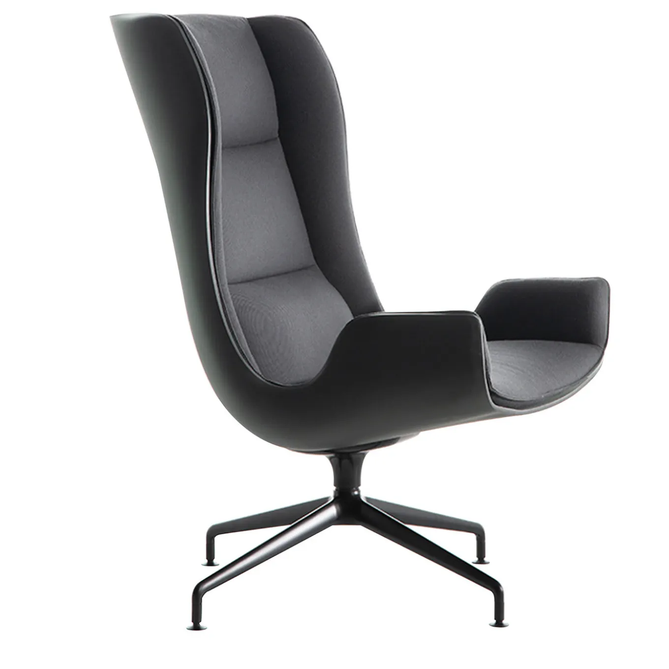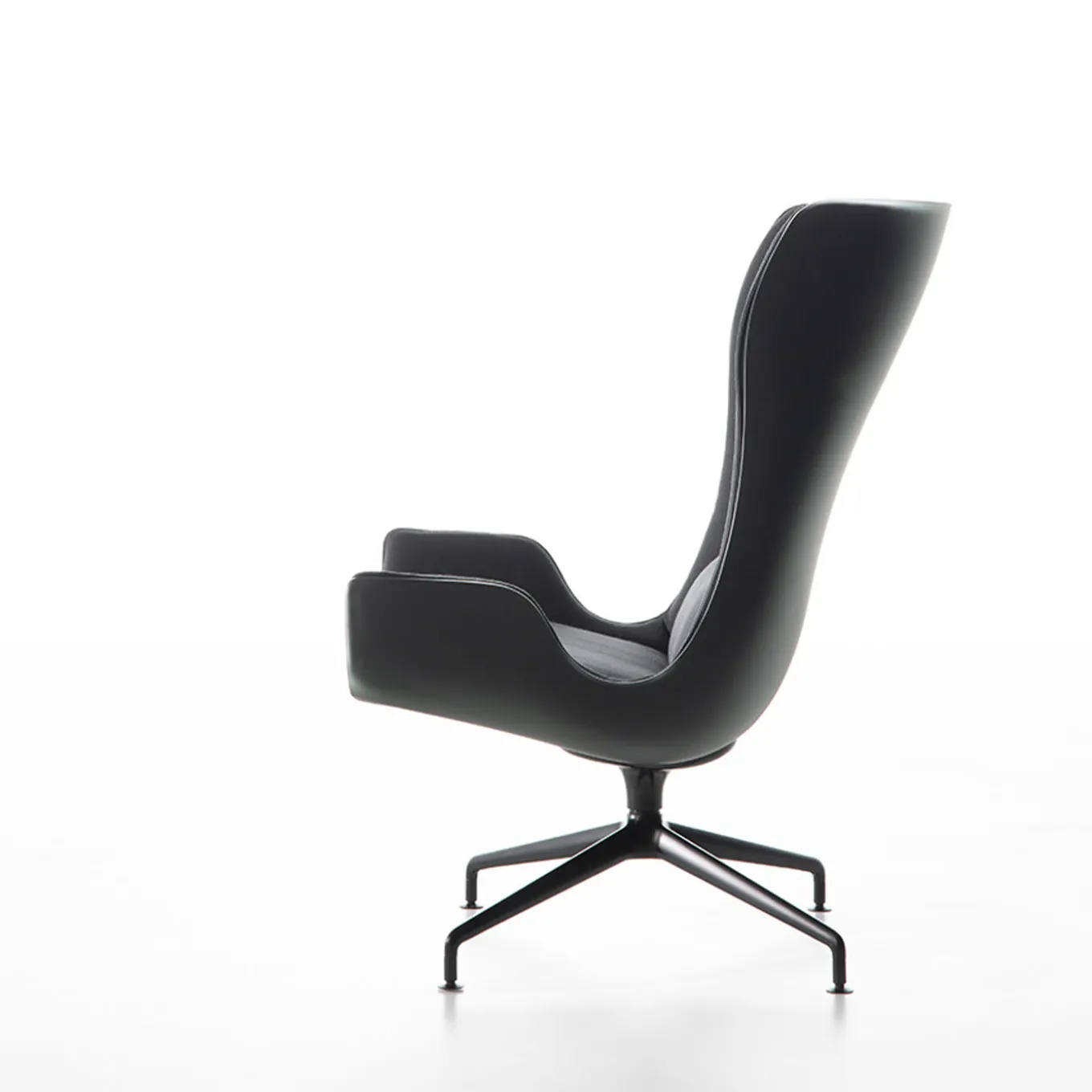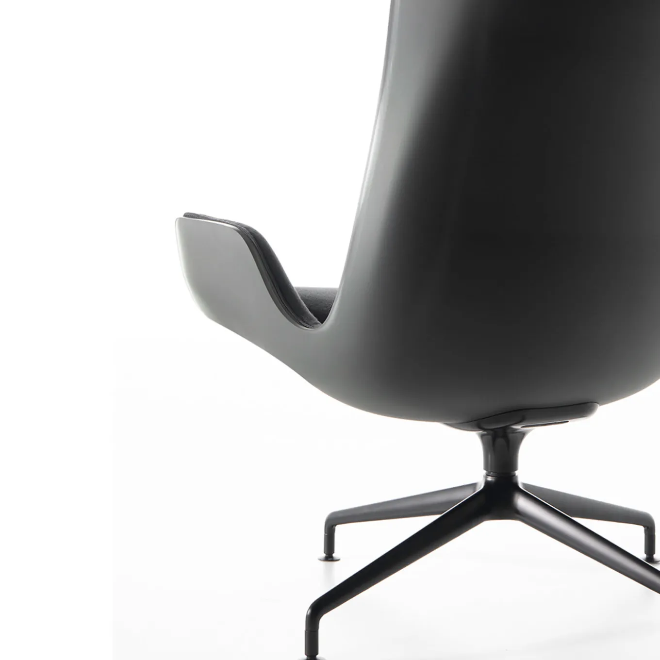 The dynamic and enveloping profile of this armchair is an invitation to mindfulness and relaxation. Work or study in comfort with its soft, padded cushion and its nest-like outer shell fashioned of black methacrylate. The die-cast aluminum base comprising four spokes matches the color palette with its matte, lead-gray lacquer. Please consult the Concierge for available customization options.