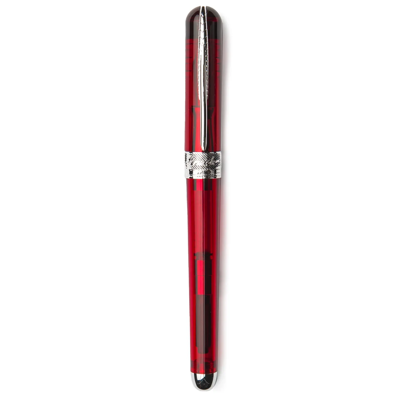 Crafted of semi-transparent, red UltraResin – shock-resistant, pure material developed by Pineider – this fountain pen with soft-close cap lock allows to keep its ink level monitored while not compromising on glamour. A feather-shaped clip in marine steel, palladium 0.2 details, and a central band with a deftly engraved Florentine skyline add shininess to the whole. The 3D technology featured allows for a perfectly interlocking system where glues are not necessary. Other color options and N°6 steel nib sizes are available, consult the Concierge. Cartridge filling is also supported.