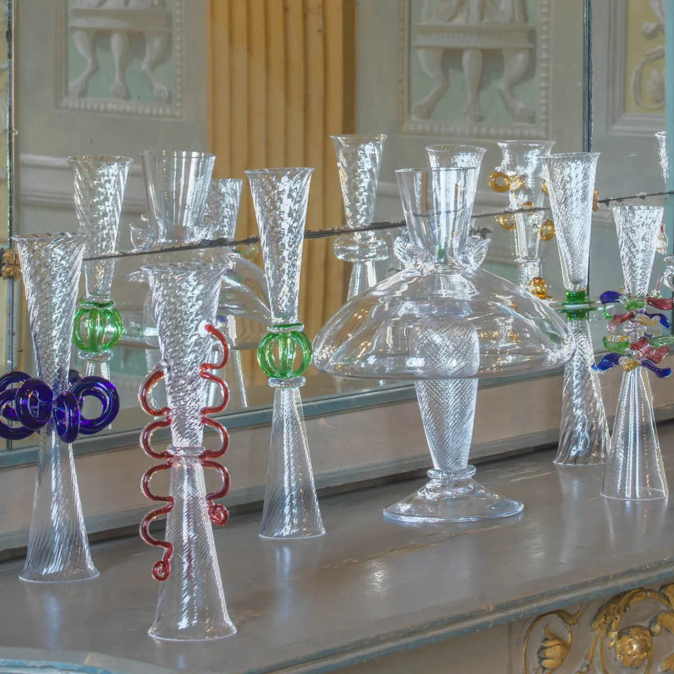 Blue glass rings encircle this stunning glass, a singular piece embodying designer Borek Sipek’s creative spirit. A precious piece perfect to enrich exclusive collectors’ series, it sports a slender silhouette whose conical volumes are minutely decorated with raised ridged and twisted textures attesting to its artisan value.