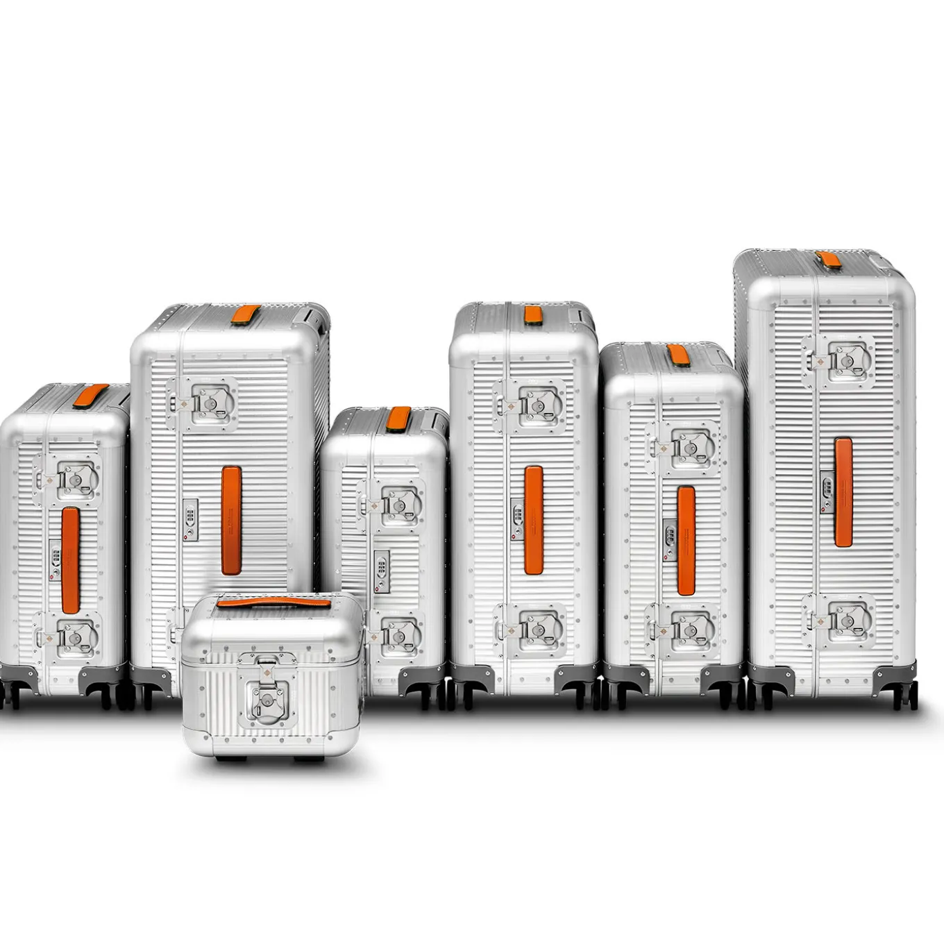 Exclusively Made in Italy, the Bank suitcases are inspired by the olden day trunks revised in a modern way. The aluminum shells, 10 microns (?) thick, combined with the special Butterfly locks, guarantee protection and resistance to the elements. The dual wheels ensure ease of transport and the interior with compartment dividers and leather details provide a perfect organization of the content.