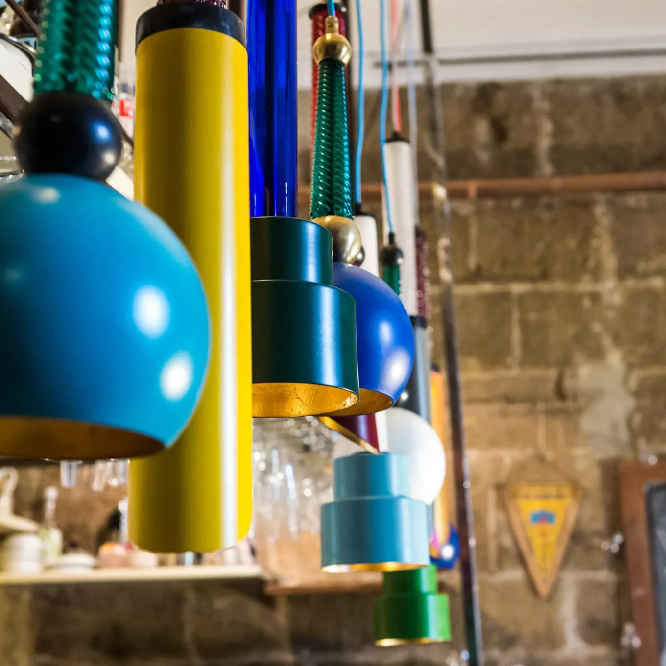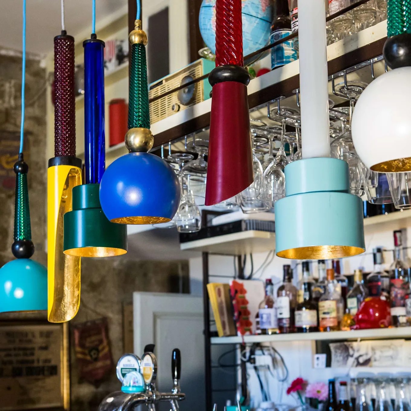 Shaped like a flashlight, this elegant and modern ceiling lamp will be an eye-catching and colorful addition in a contemporary interior. The brass structure has a black finish and is adorned with a cylindrical insert in blue glass, whose smooth and mesmerizing look elegantly complements the black lacquer of the aluminum shade, which boasts a prefocus gold leaf on the inside. The bulb is a G9 max 18W LED. This piece will provide a striking decoration and a delicate ambiance light either alone or combined in a cluster with others from the same series.