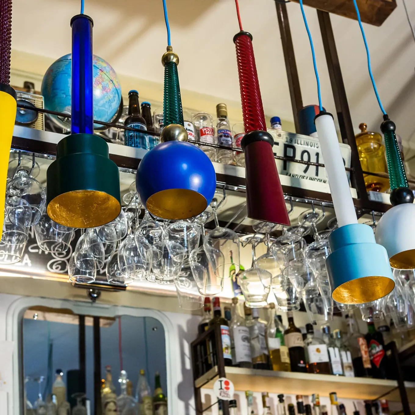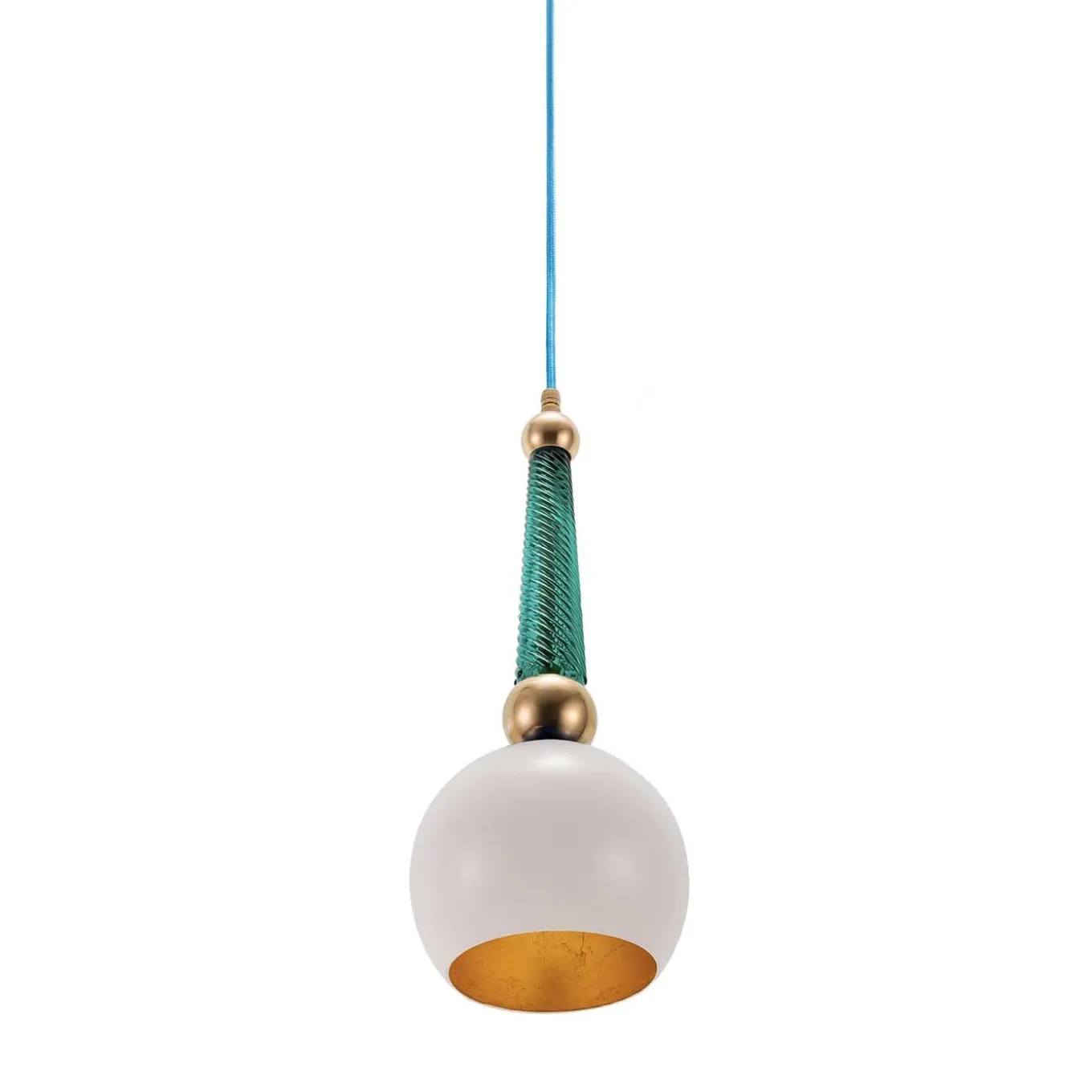 Part of the B’Anthology Collection, this stunning ceiling lamp evokes simple mid-century style revisited with an eclectic use of color and elegant materials and finishes for a striking effect. The support of the aluminum shade is crafted of brass with a natural finish and adorned by an green glass insert with a spiraling decoration of parallel grooves. The stunning white lacquer on the shade is complemented by the luxe gold leaf that coats its interior. The bulb is a LED G9 max 18W.