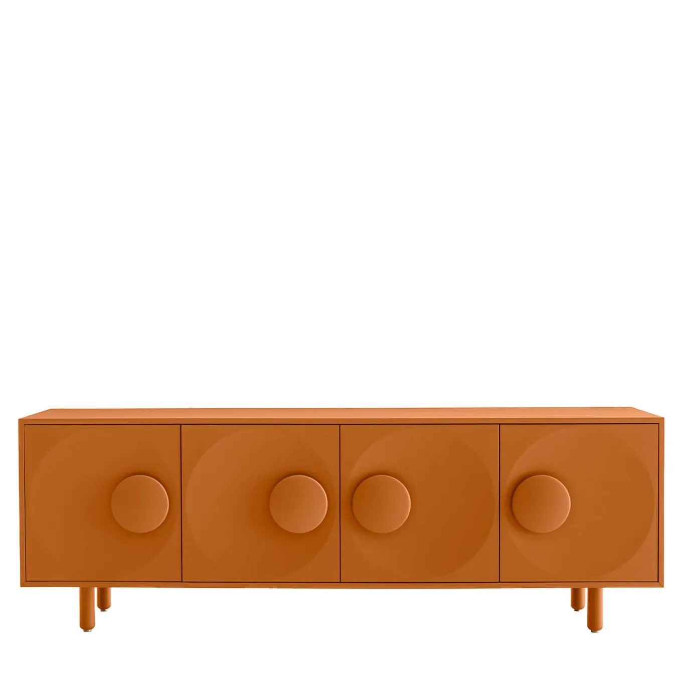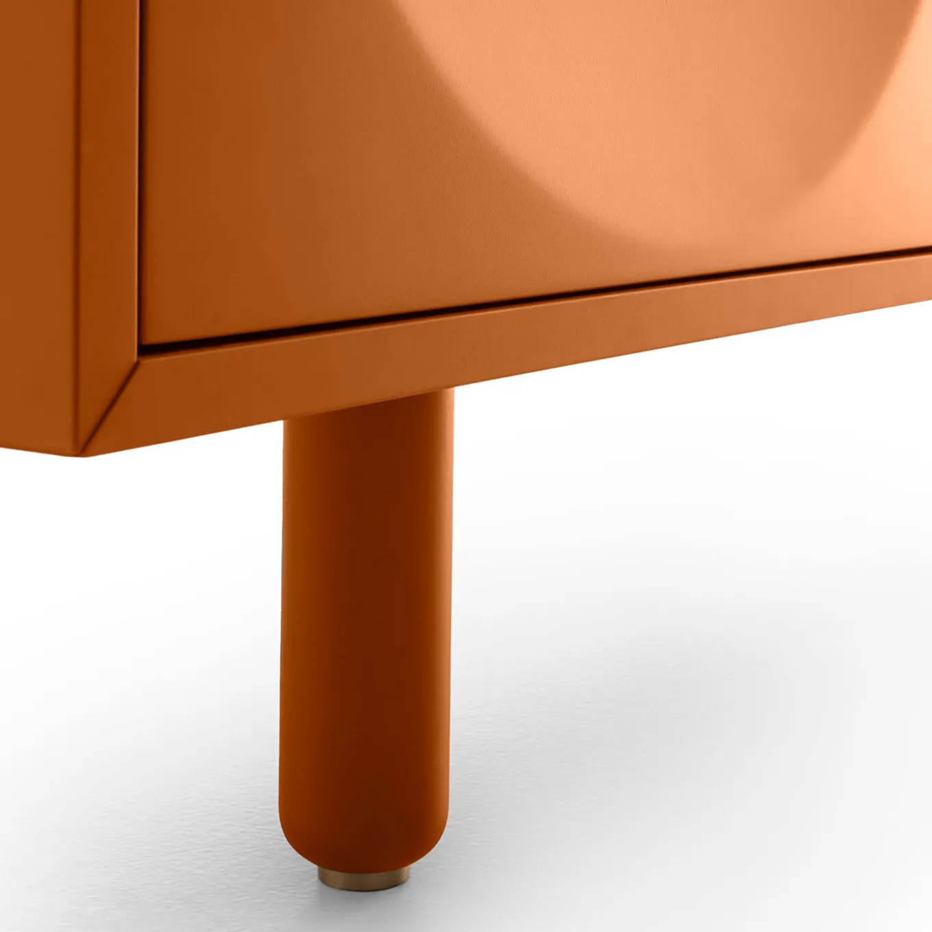 A vibrant and warm terracotta hue lends a seductive sense of authenticity to this sideboard, standing out for its button-like handles inspired by the popularity of sartorial buttons in France during the ’20s. Slight concavities also characterize the doors, further enhancing the piece’s textural dynamism. Customized storage solutions are offered by the two inner durmast-veneered drawers and two adjustable smoky glass shelves.