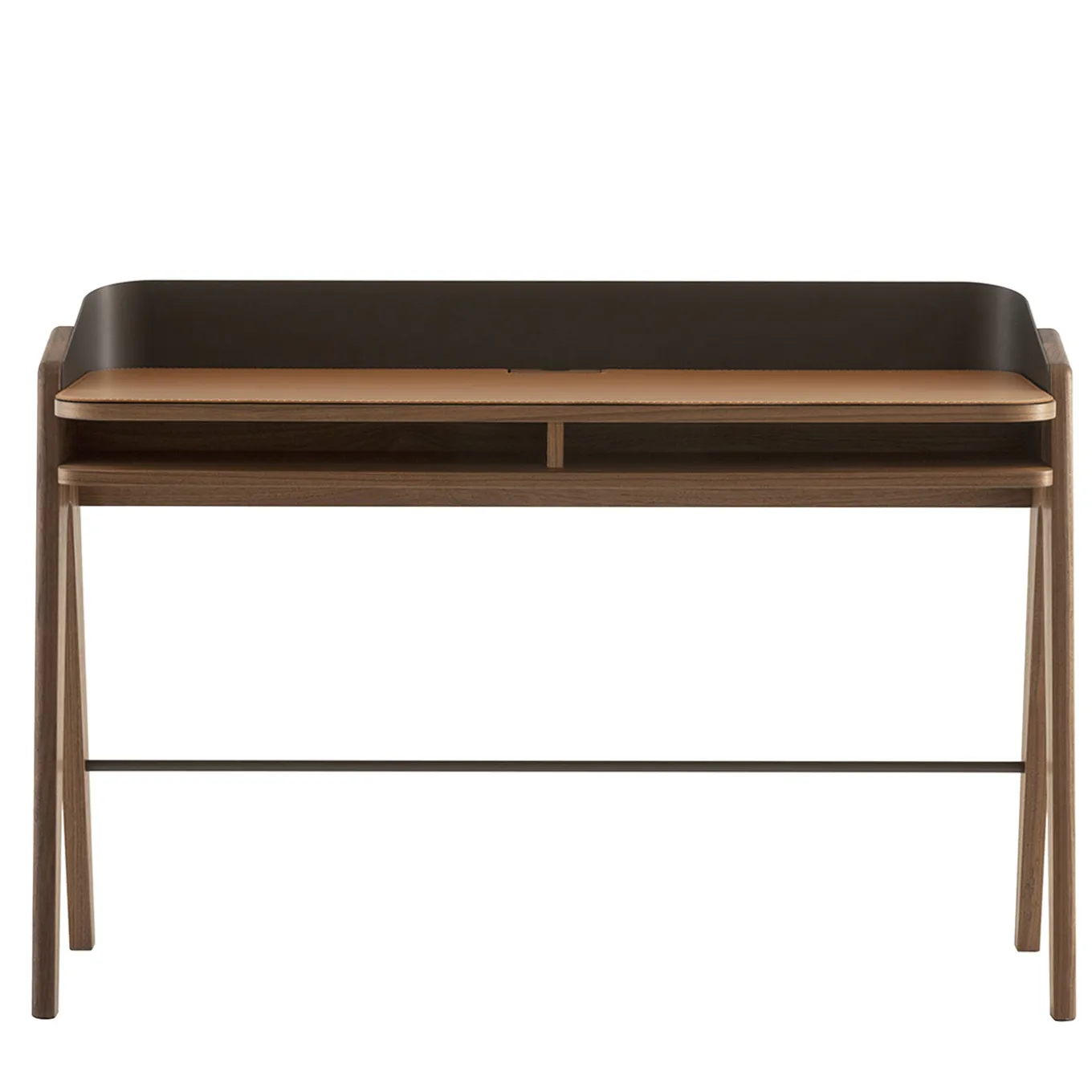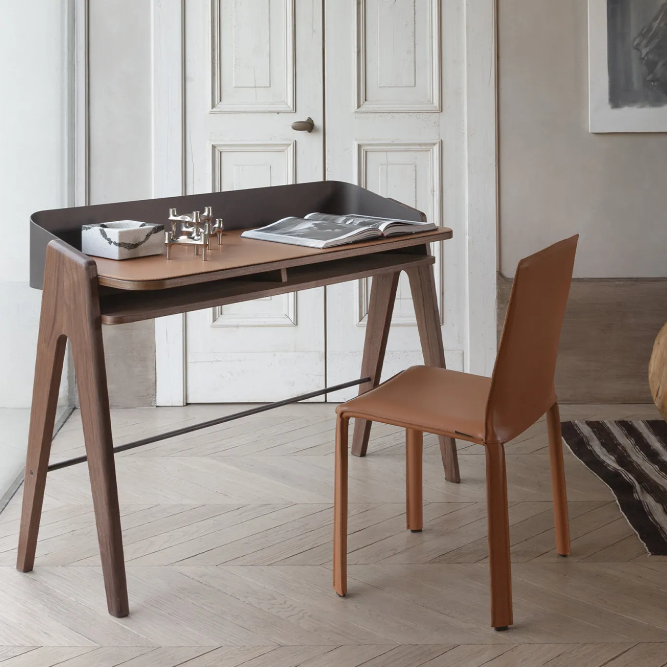 The Bavero desk combines an elegant, curved metal frame with a smooth cognac leather pad, creating a seamless design without visible screws. This desk features a wooden structure with slender walnut legs and includes a practical shelf beneath the work surface, making it ideal for smart working environments. The leather surface enhances comfort while the walnut legs provide stability and a refined aesthetic.