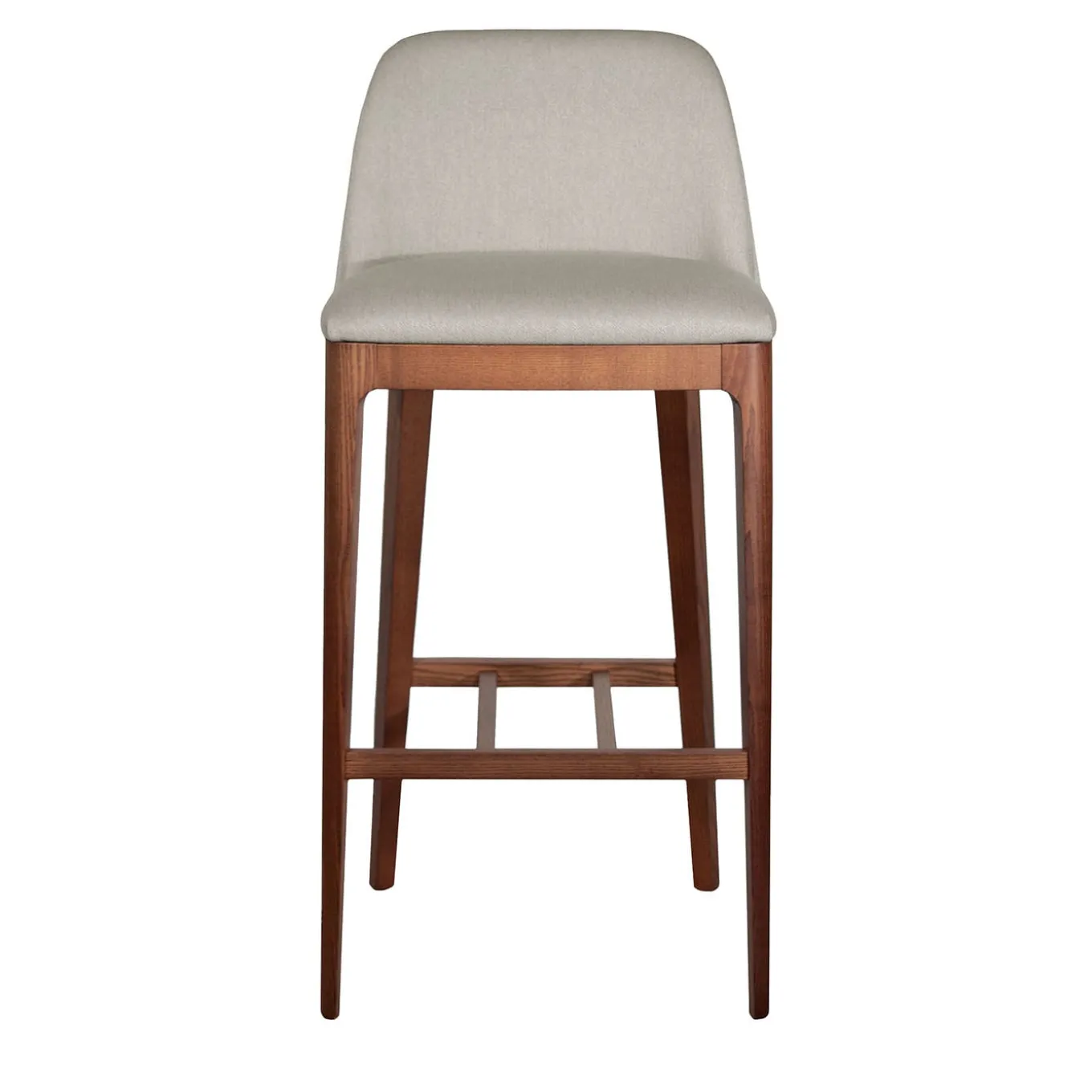 A clean and elegant design distinguished by softly rounded lines, this stool features a solid ash wood frame of simple yet rigorous geometry, supporting a softly padded seat with backrest, minutely covered with leather, faux leather, or fabric from the collection. Please consult the Concierge for further information and available customization options.