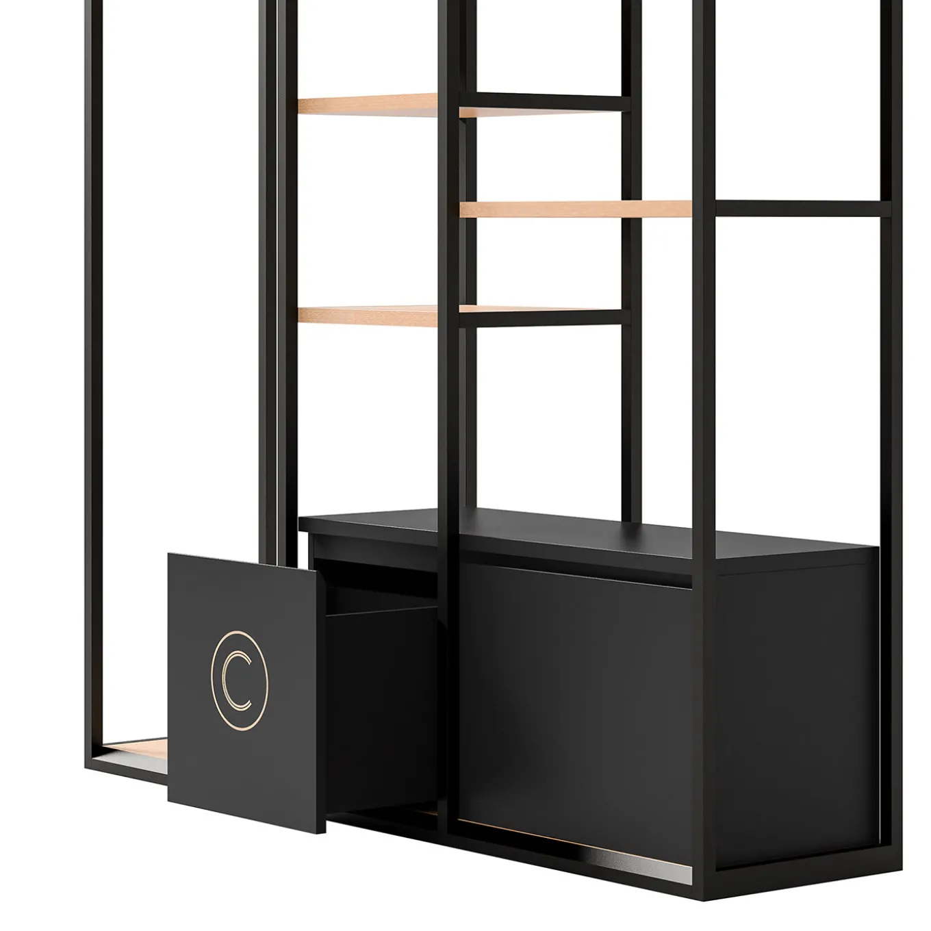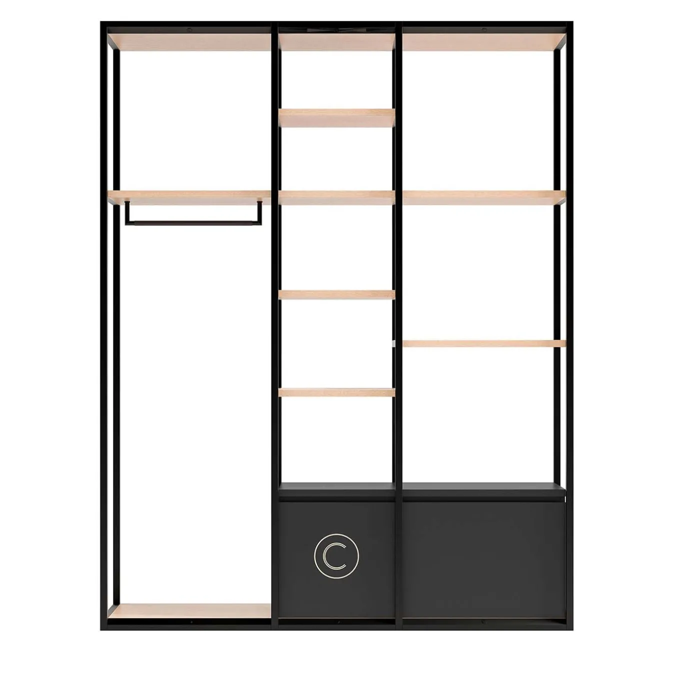 The minimalist flair and floating appearance of this sophisticated shelving unit will add style to a modern and minimalist bedroom. This eclectic piece is framed in black-finished metal with light veneered shelves and comprises three sections, each with different accessories, to provide a wide array of functional storage in an open silhouette. The central column has four shelves and a bottom drawer, while the lateral sections include a hanging rod and two shelves with a bottom drawer. This versatile piece is the perfect solution for small residential spaces.