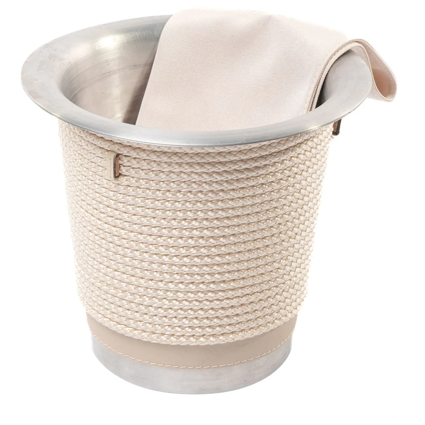 A refined and timeless reference to nautical equipment distinguishes this glacette, a piece fashioned of aluminum and richly decorated for seamlessly complementing exclusive table settings. Beige faux leather adorns the exterior together with generous color-coordinated ropes, which provide an intriguing tactile feel while inviting to dream of marine atmospheres.